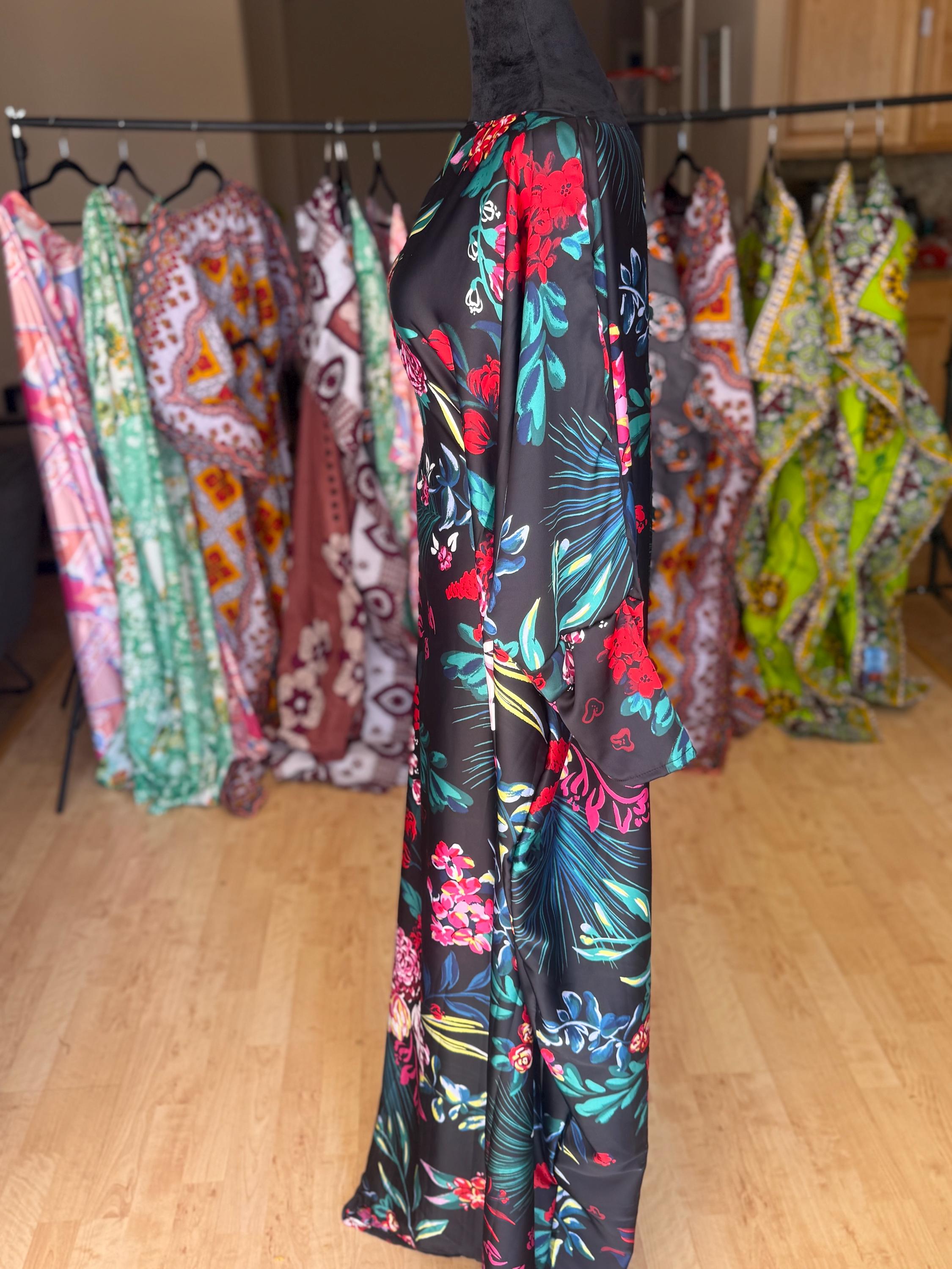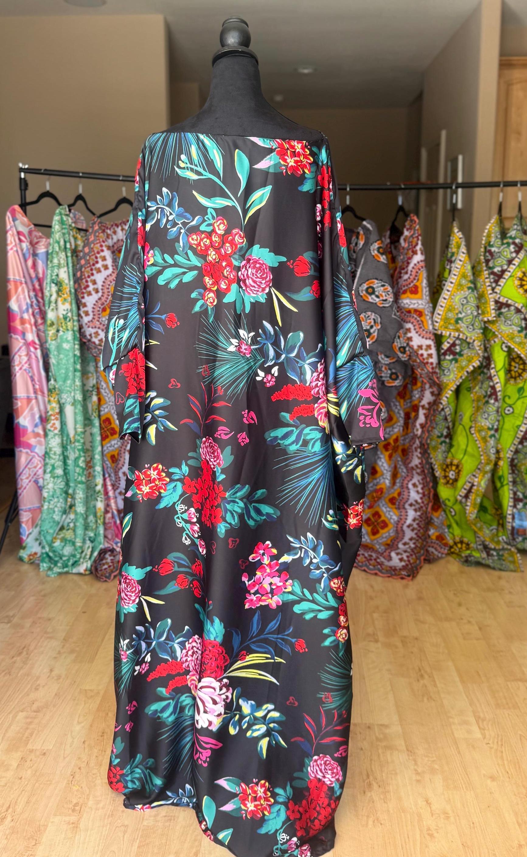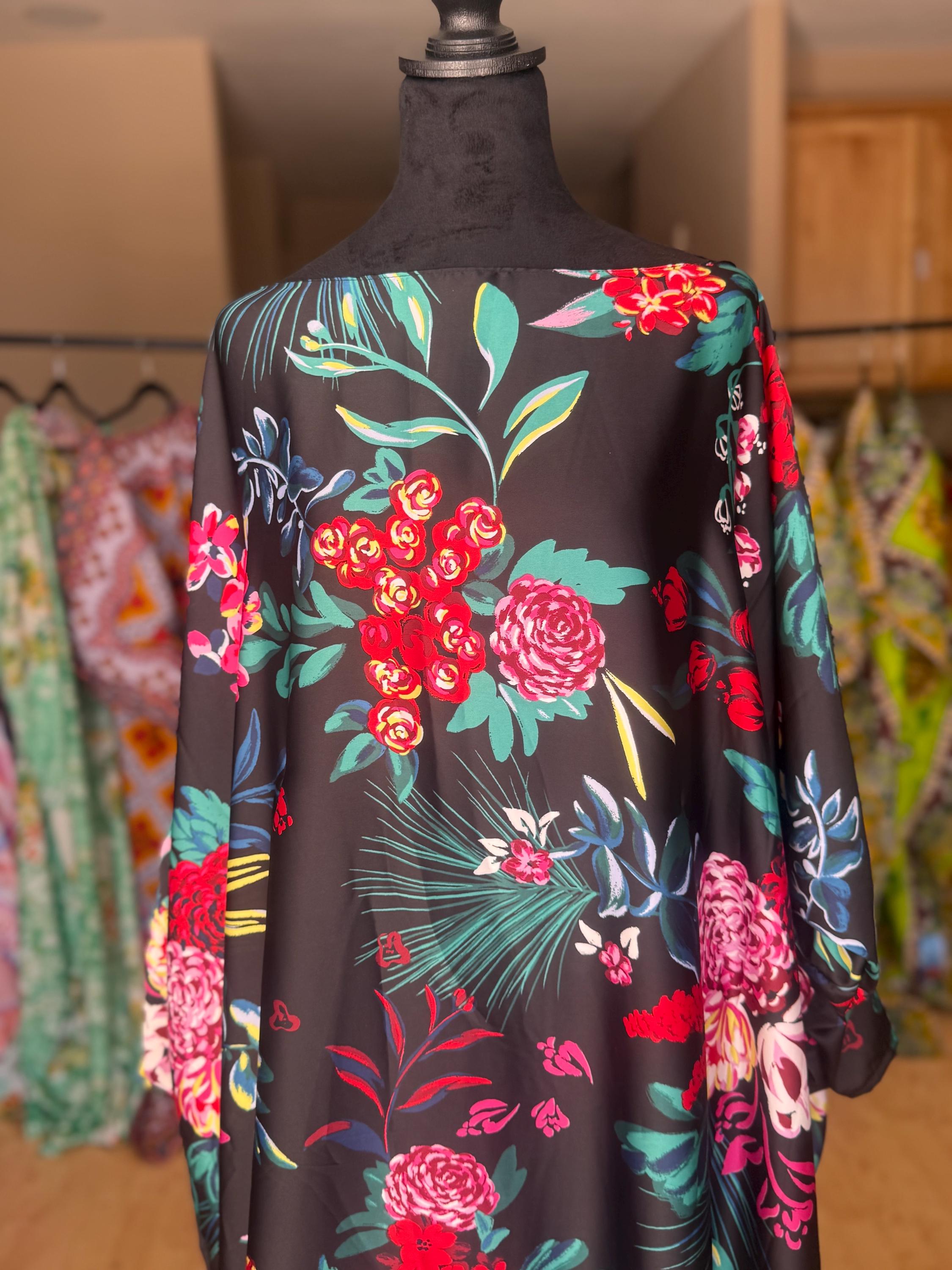 This elegant black kaftan features bold floral prints in red, pink, and teal, made with soft English satin that drapes beautifully. The fabric has a smooth feel with a subtle sheen, making it perfect for both casual lounging and special occasions.