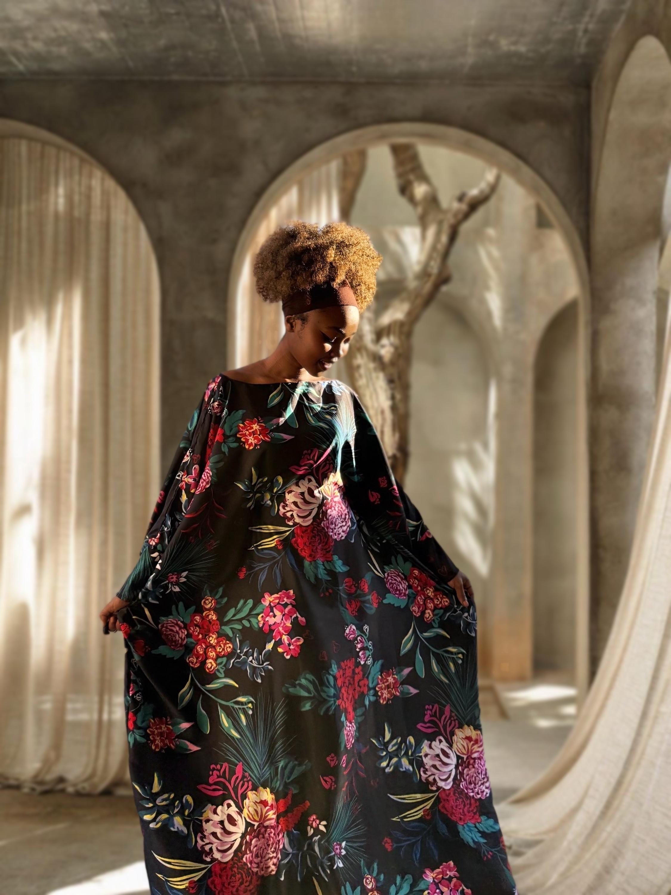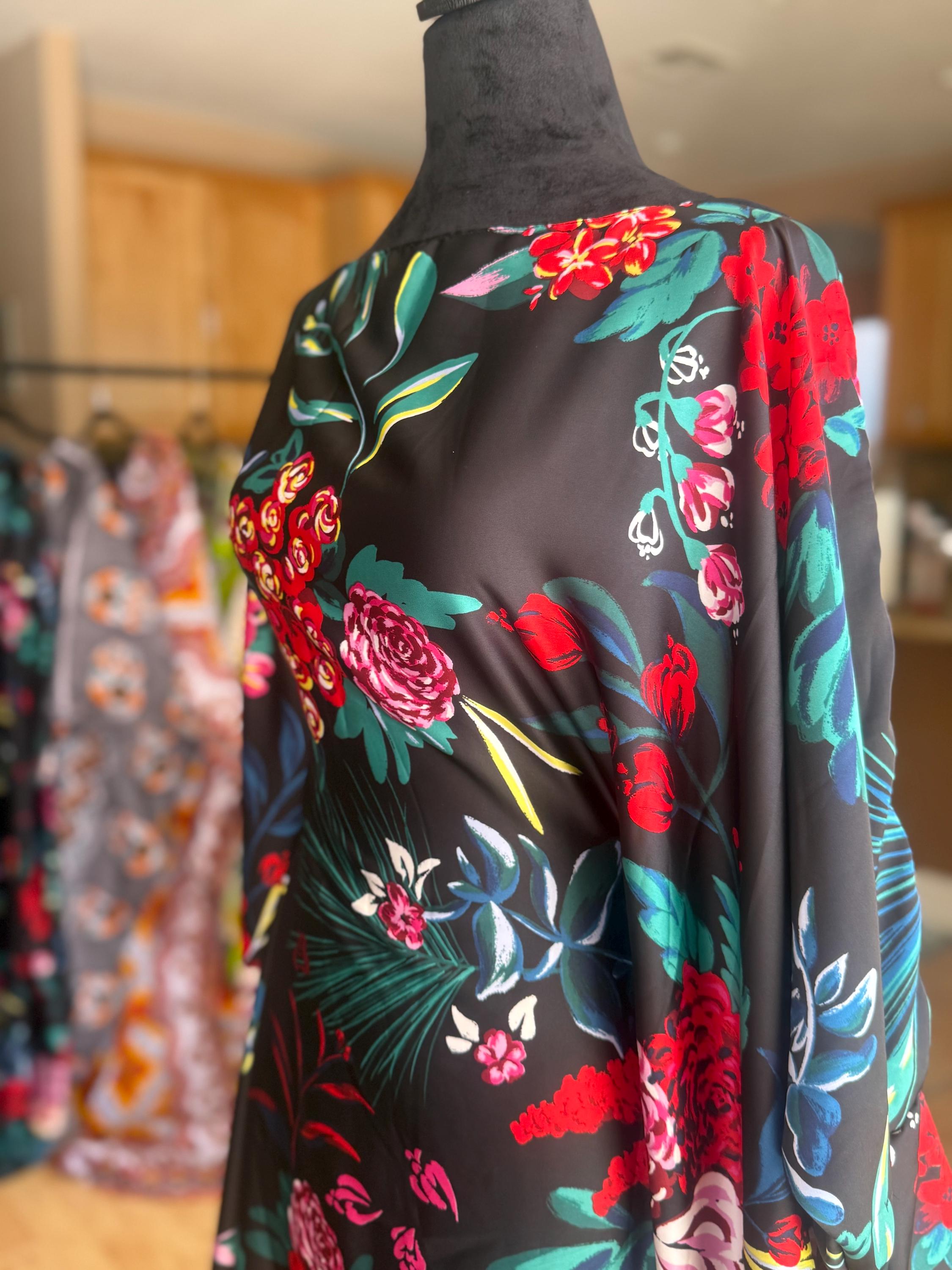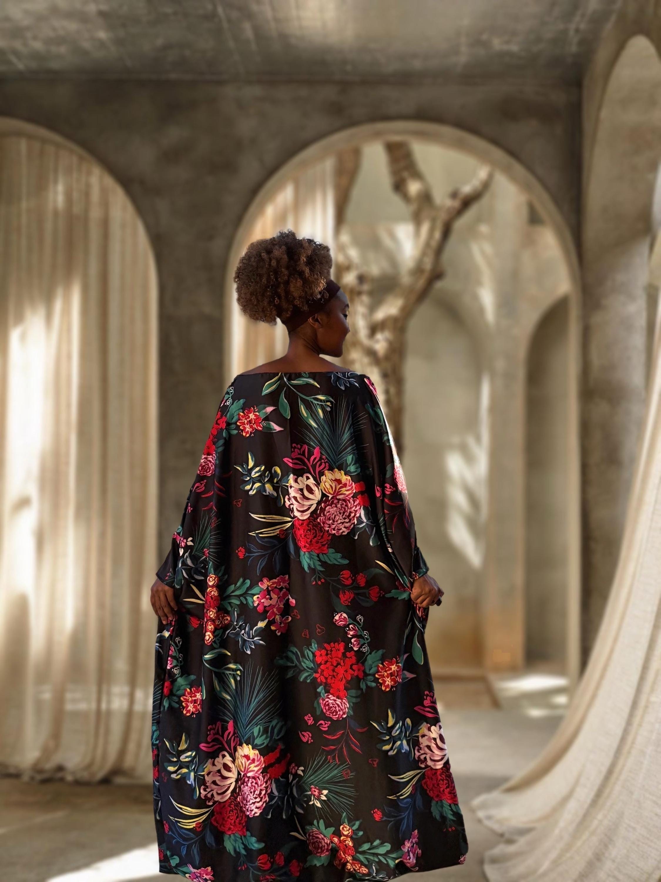 This elegant black kaftan features bold floral prints in red, pink, and teal, made with soft English satin that drapes beautifully. The fabric has a smooth feel with a subtle sheen, making it perfect for both casual lounging and special occasions.