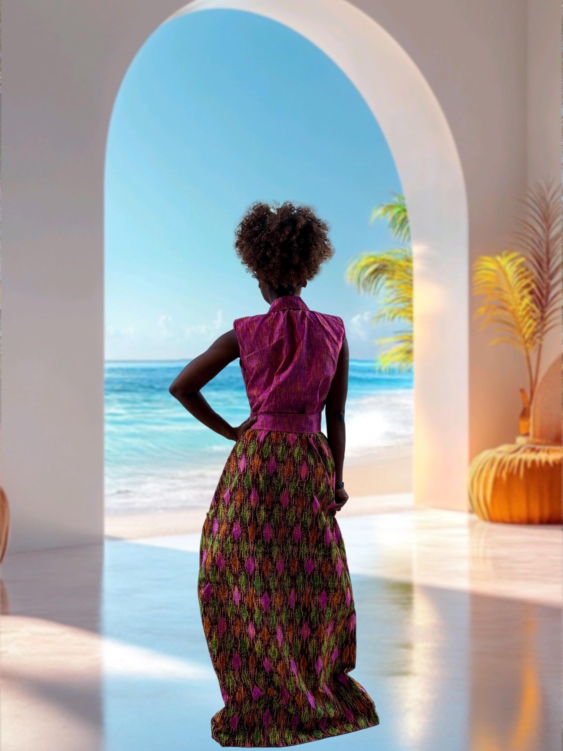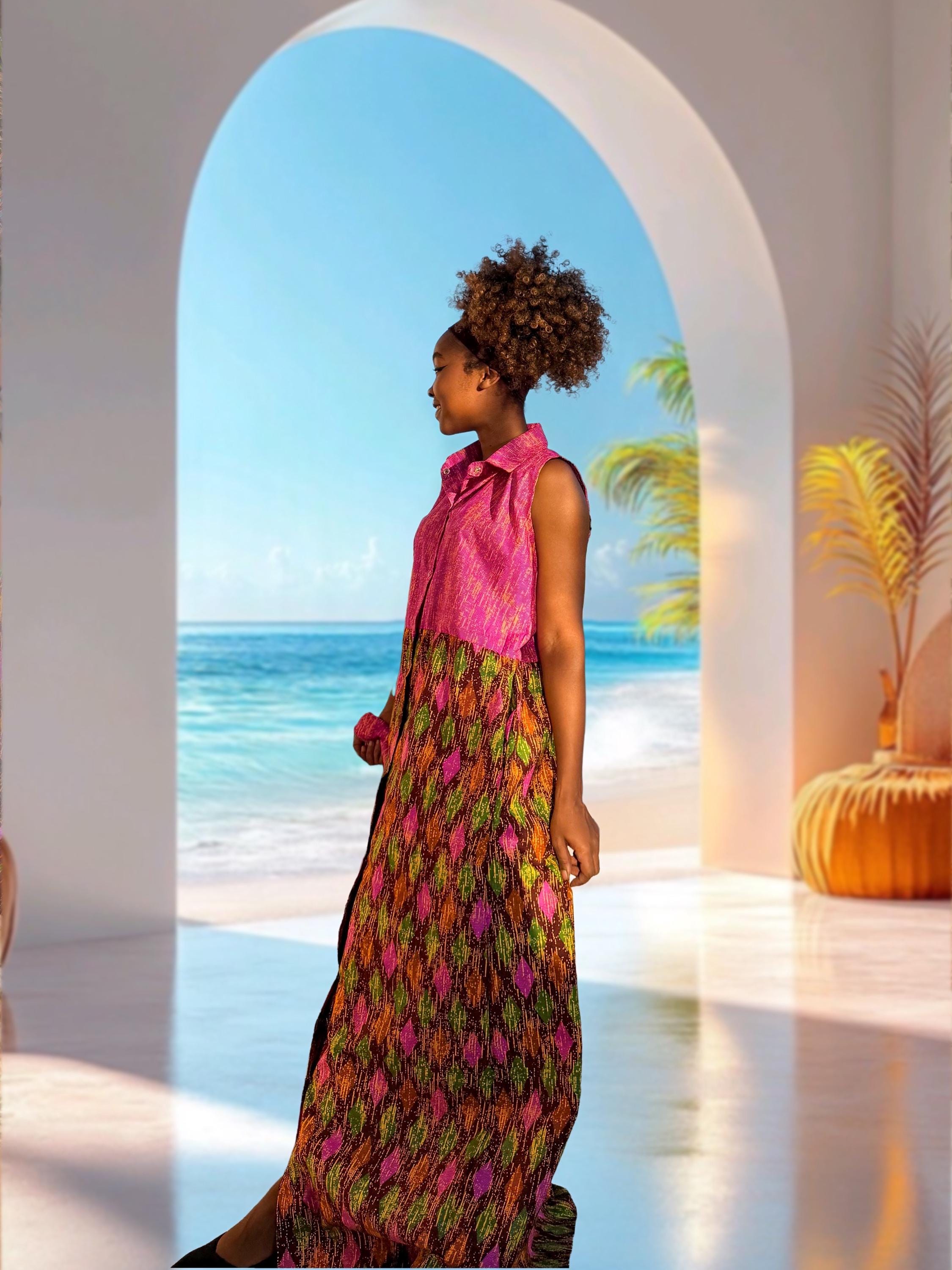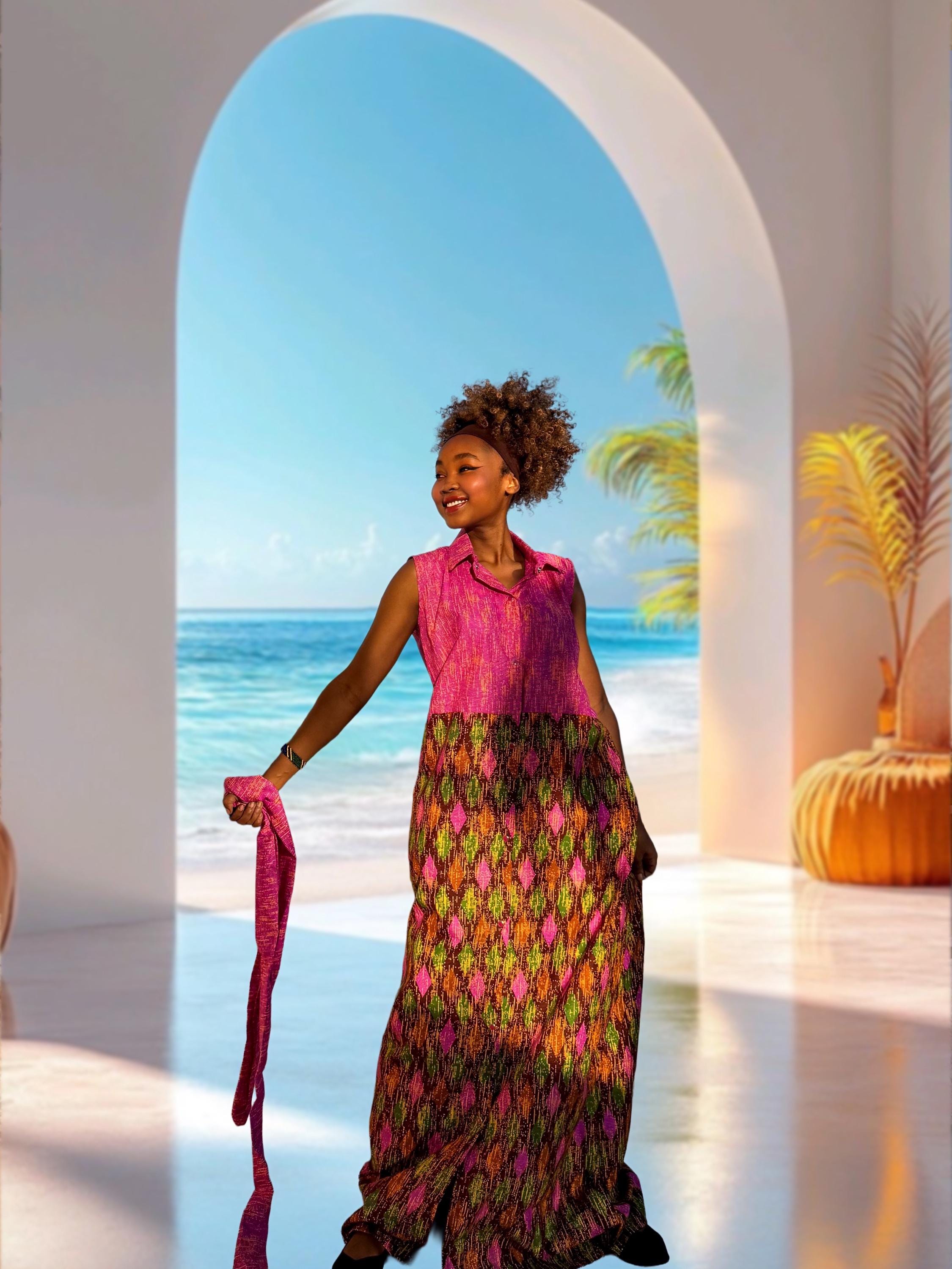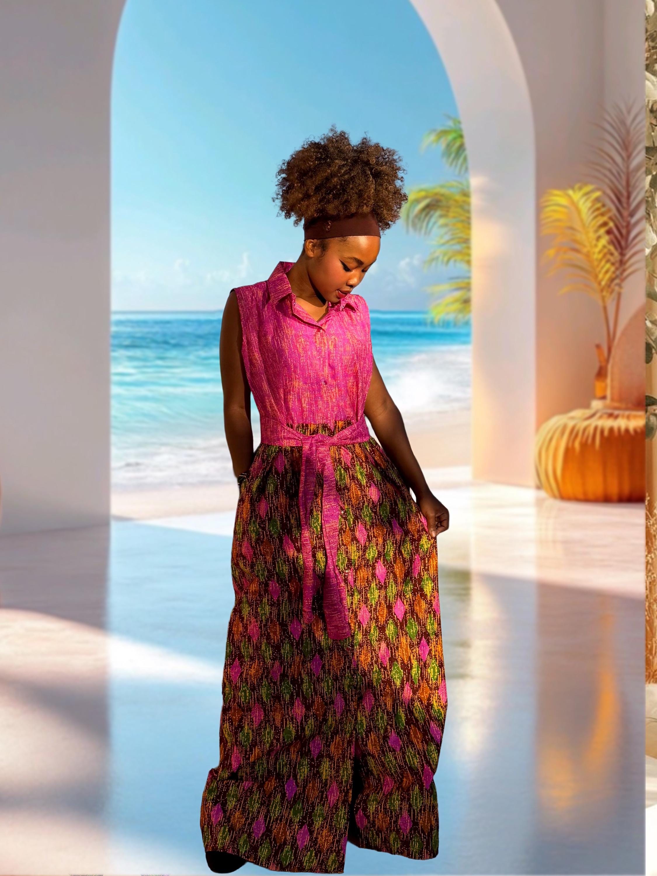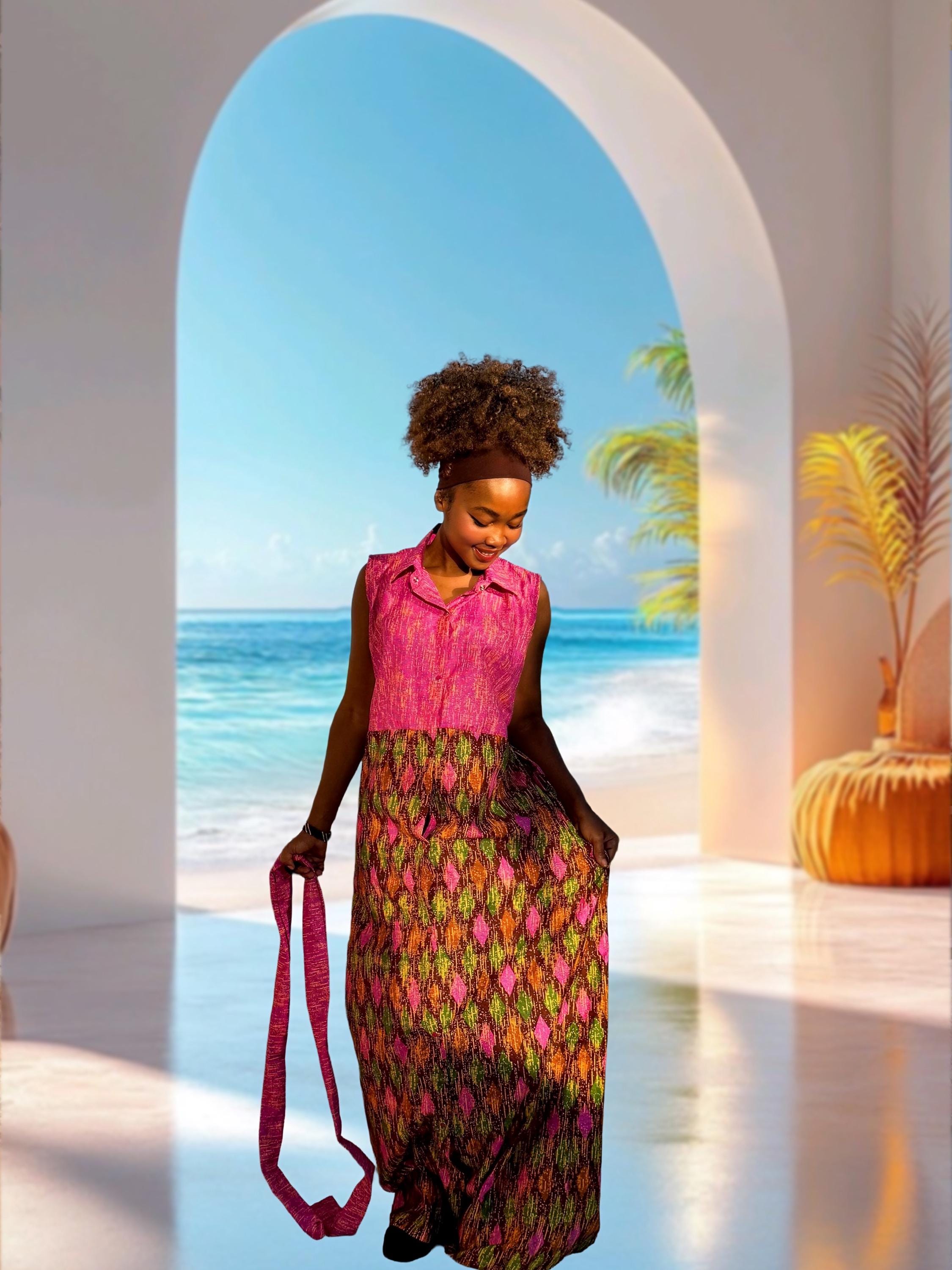 This sleeveless pink African print dress brings together bold color and everyday comfort. Made from soft, breathable 100% cotton, it features a woven-style gold and black print that stands out beautifully without being too loud. The A-line shape gives you a relaxed, flowy feel, and the matching waist tie lets you shape the dress however you like.