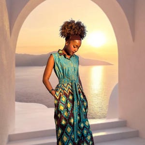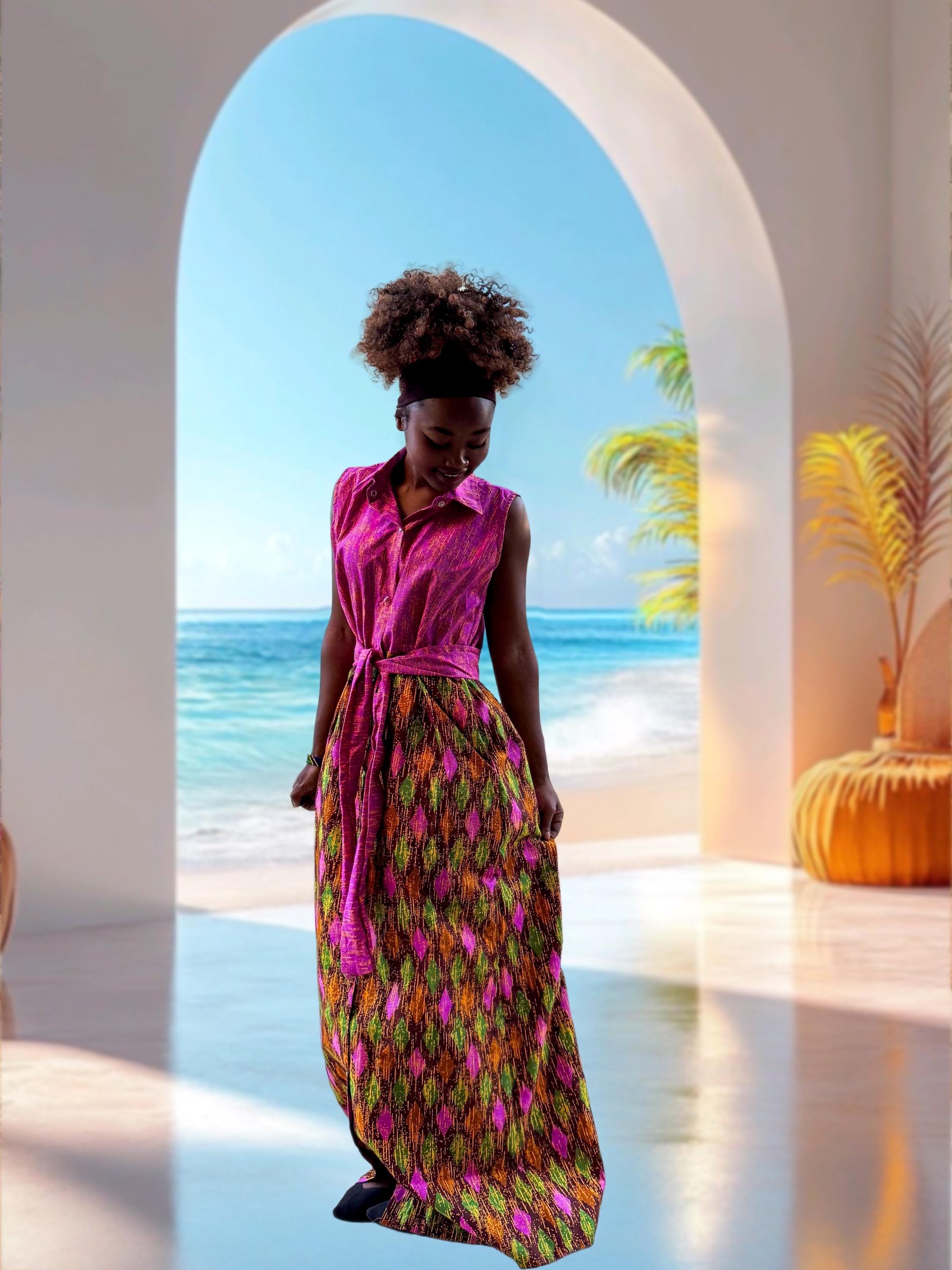 Details: • Sleeveless button-down maxi • Matching waist tie belt • Side pockets • One size (fits S–L) • Floor length (~55”) • 100% cotton (non-stretch) • Handmade in Tanzania