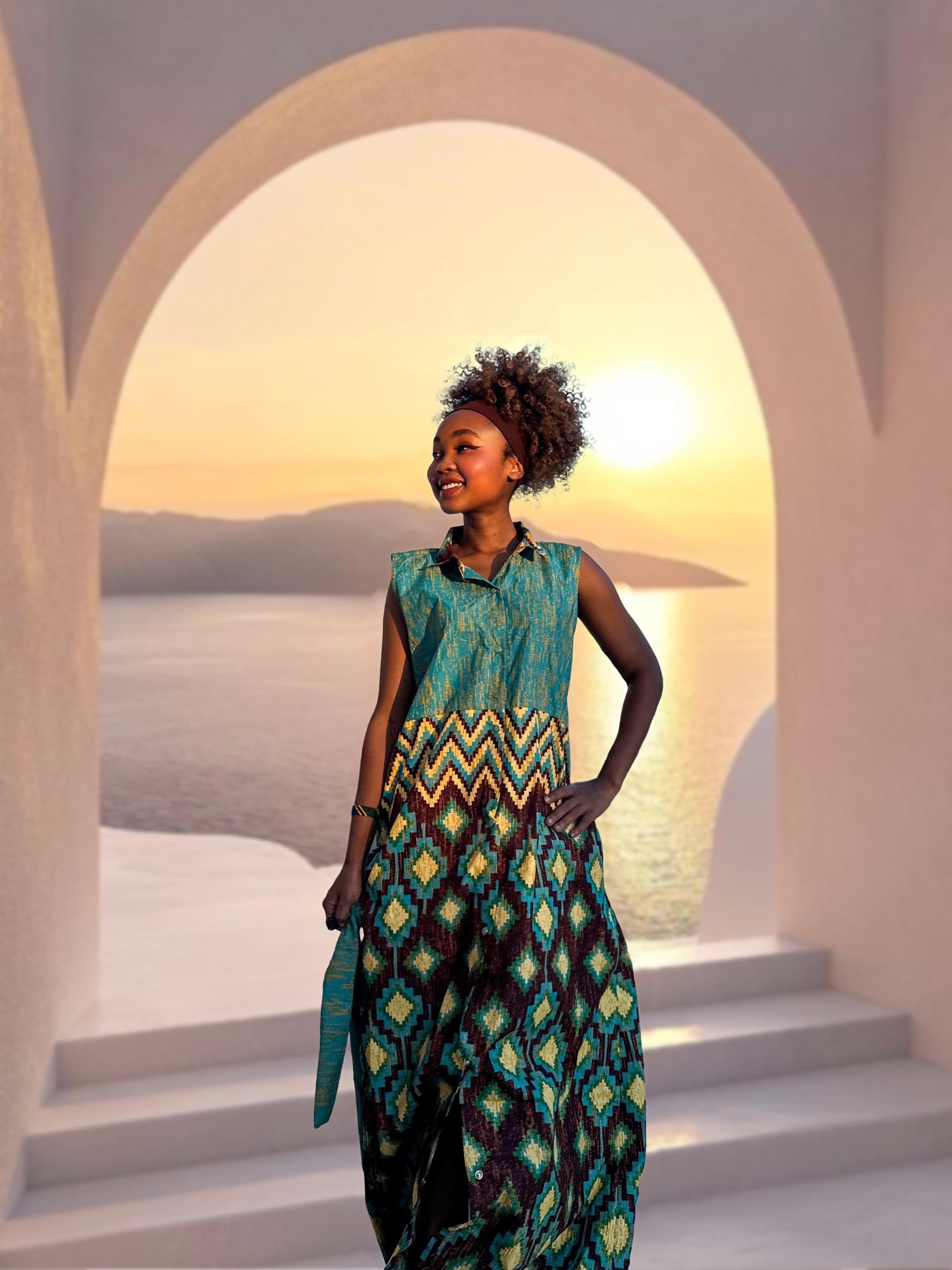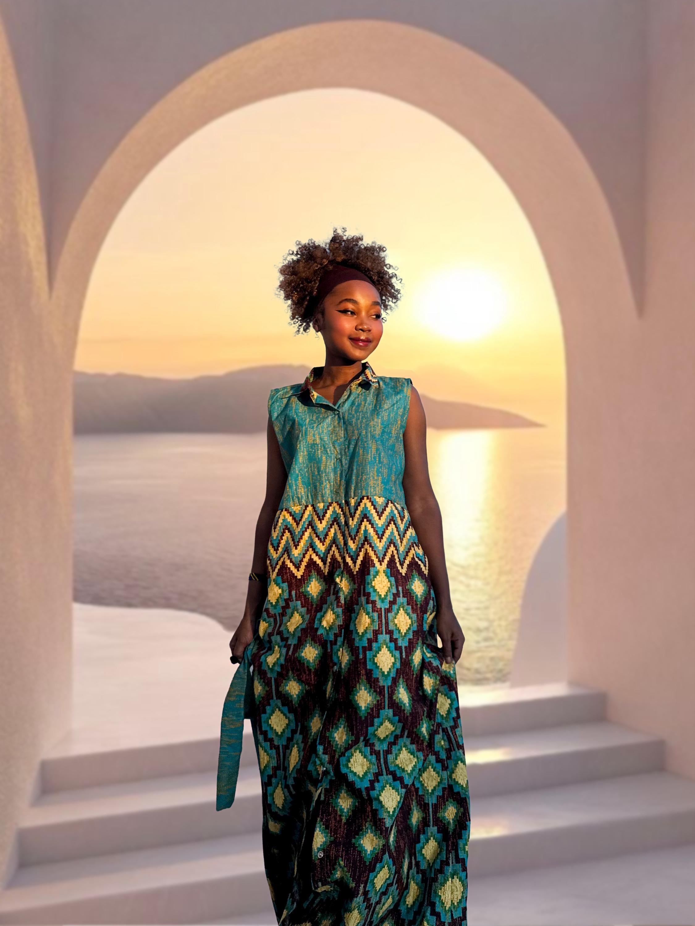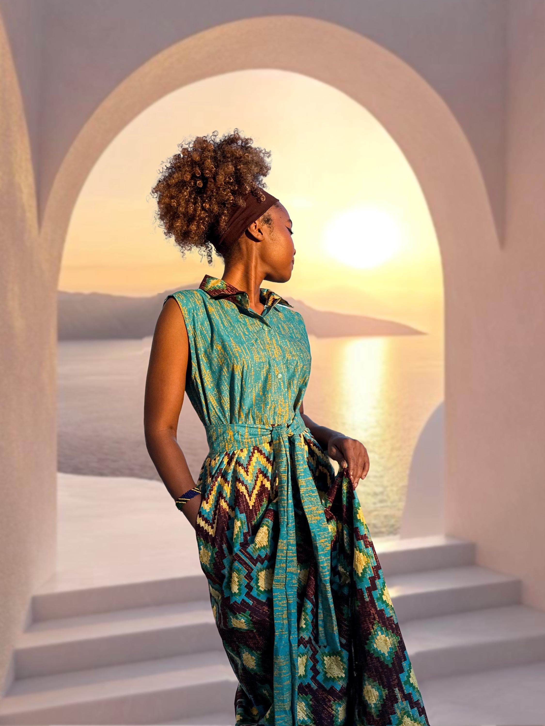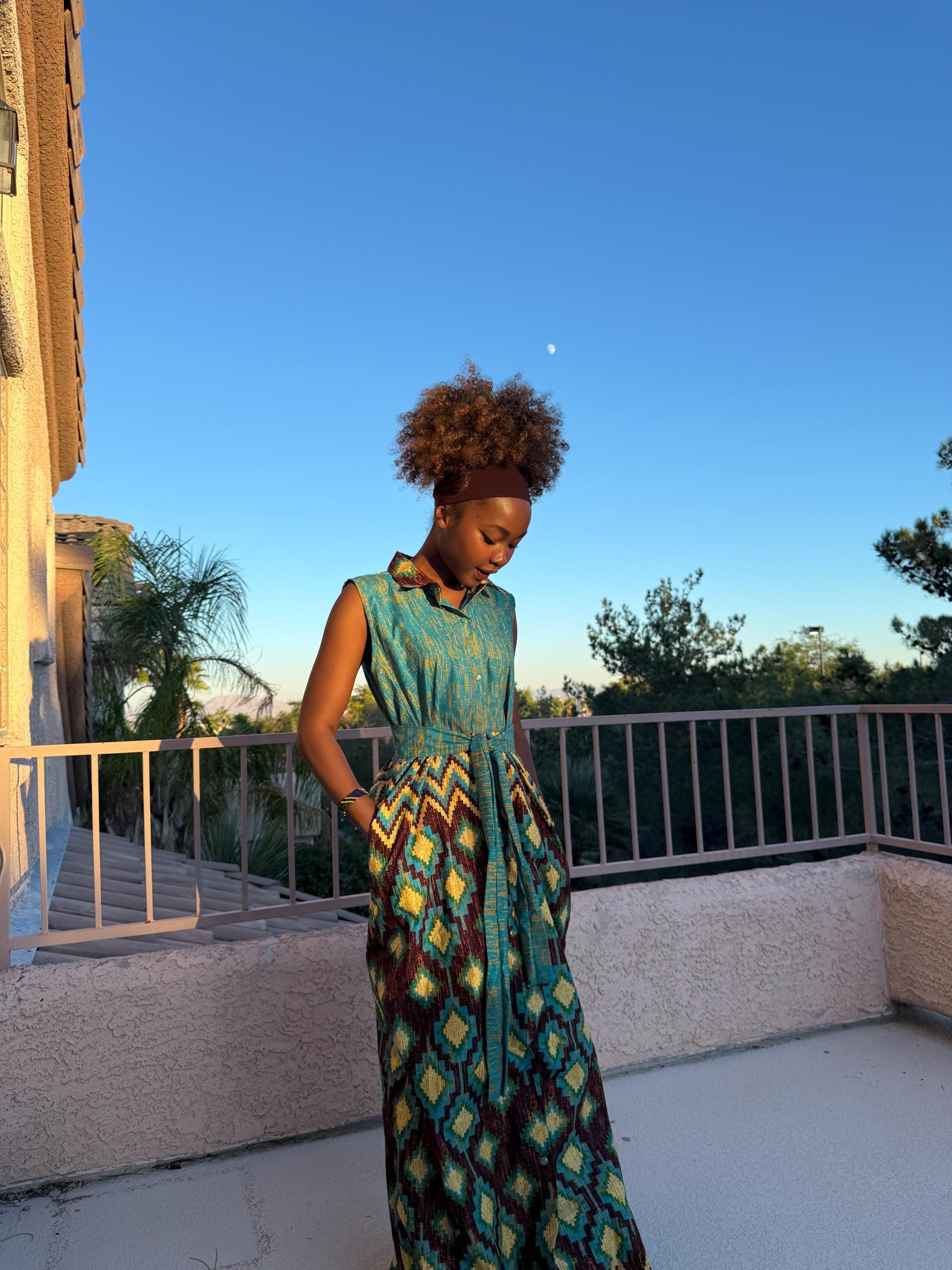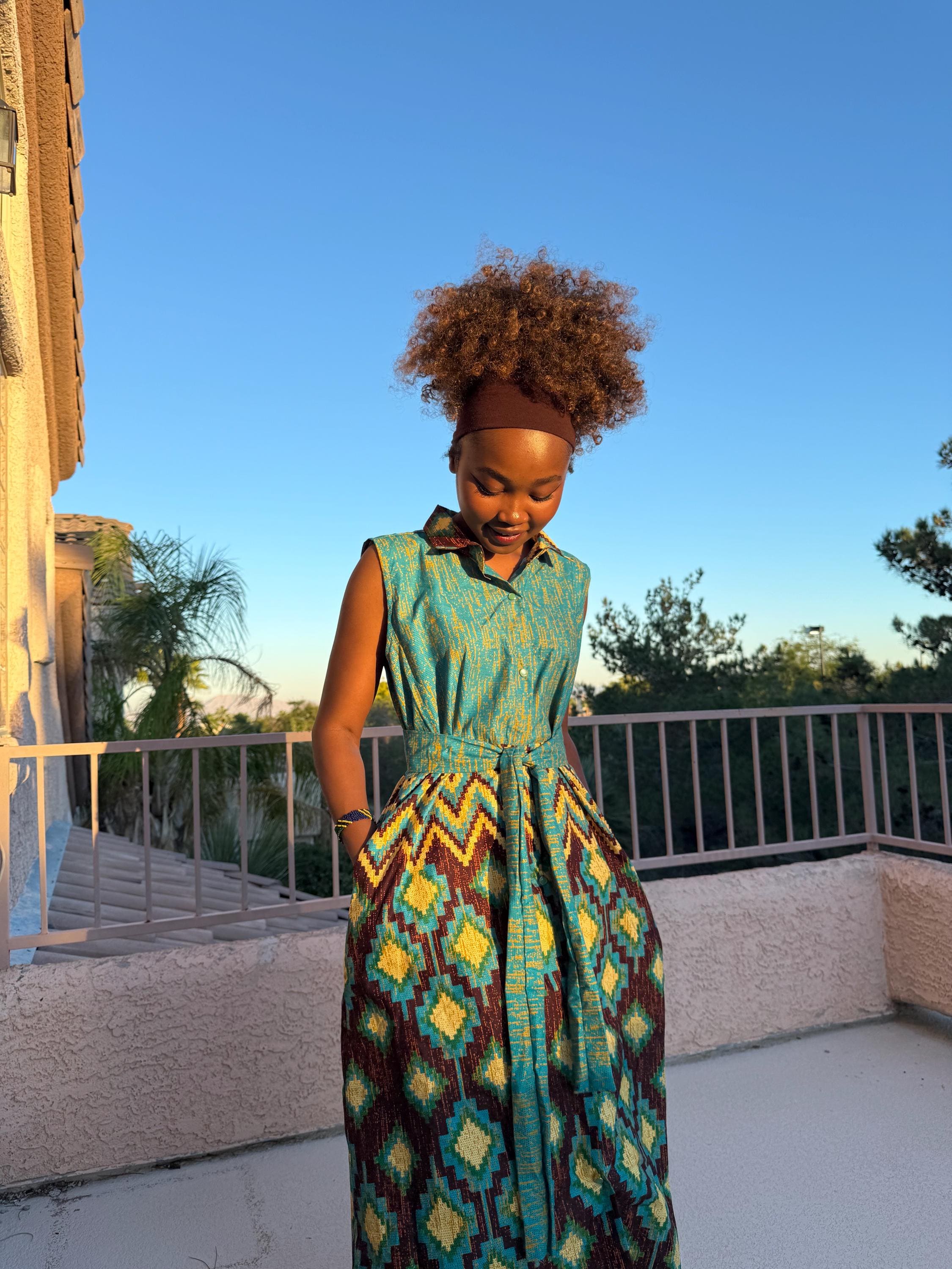 This sleeveless African print dress features a bold green-and-teal geometric kente design that gives the dress a fresh, modern look. The lightweight 100% cotton fabric makes it breathable and perfect for warm weather or travel. The A-line fit drapes nicely, and the matching belt allows you to switch between a fitted and relaxed look.