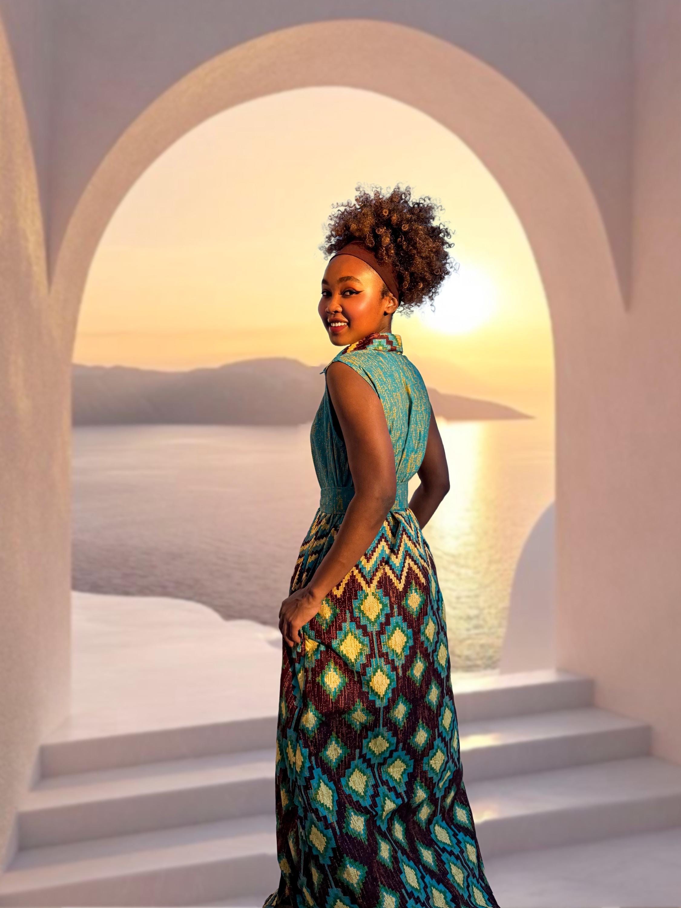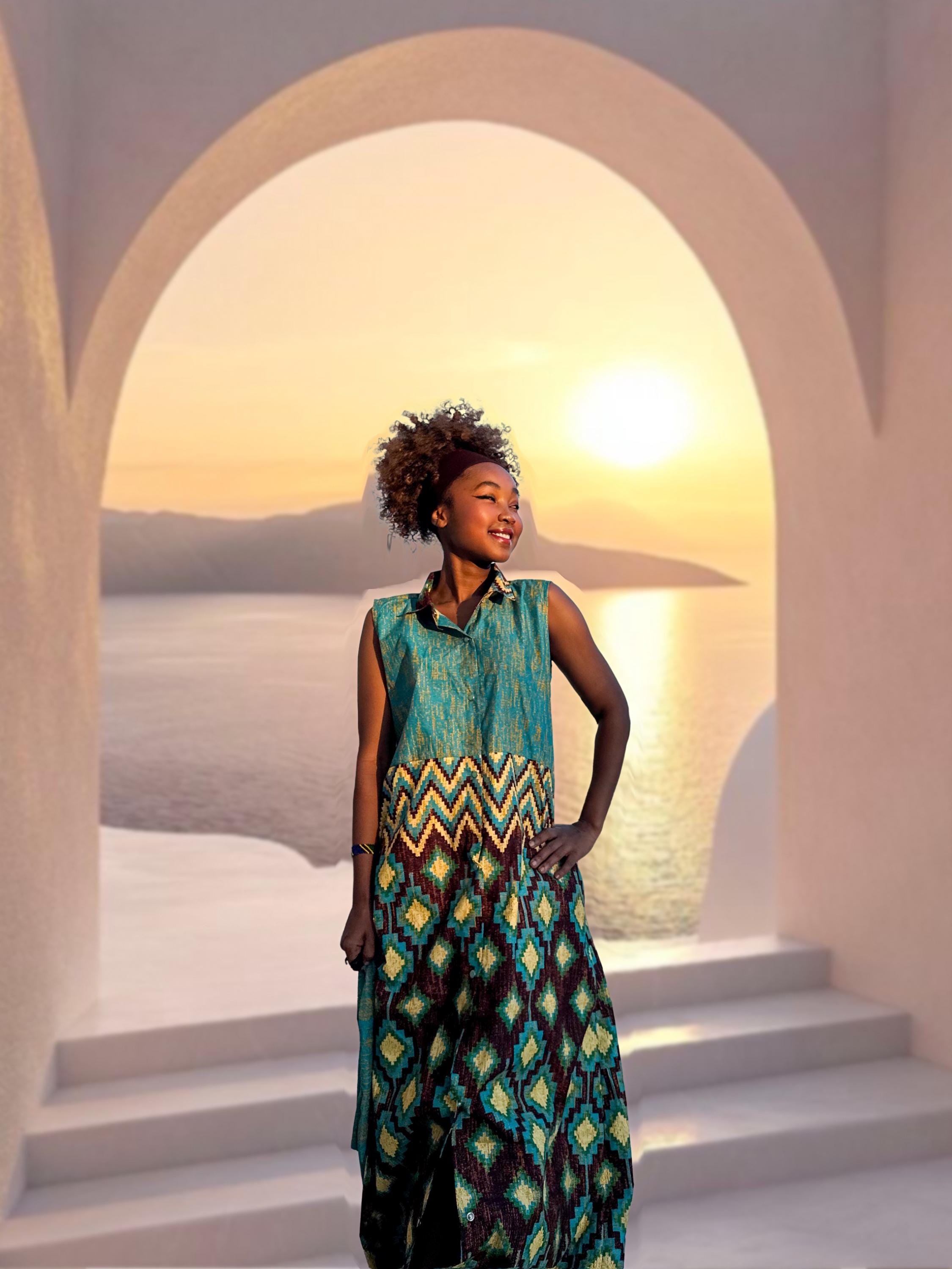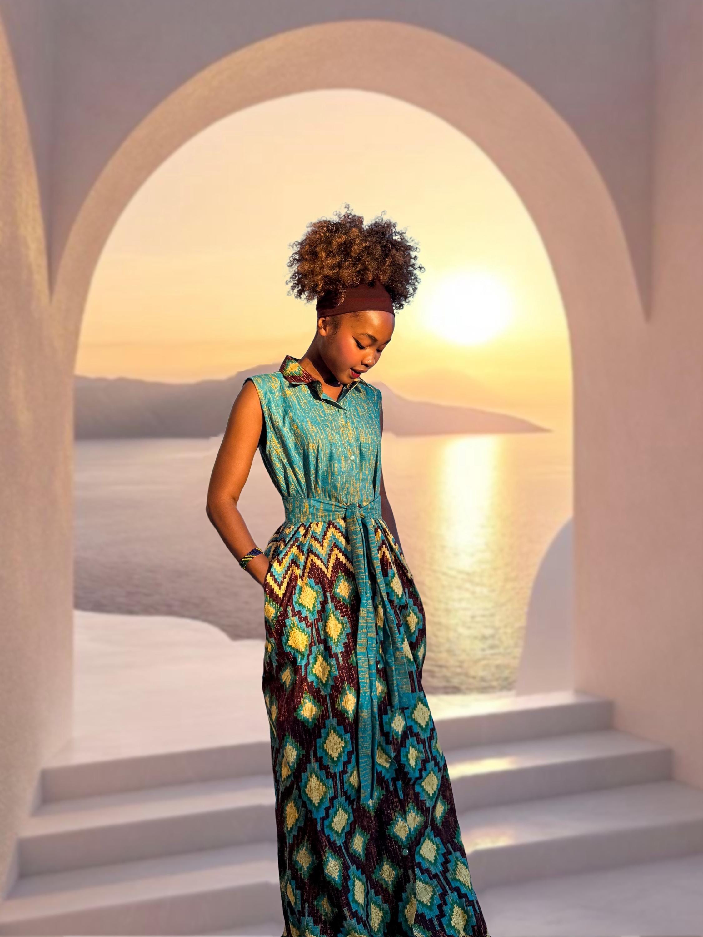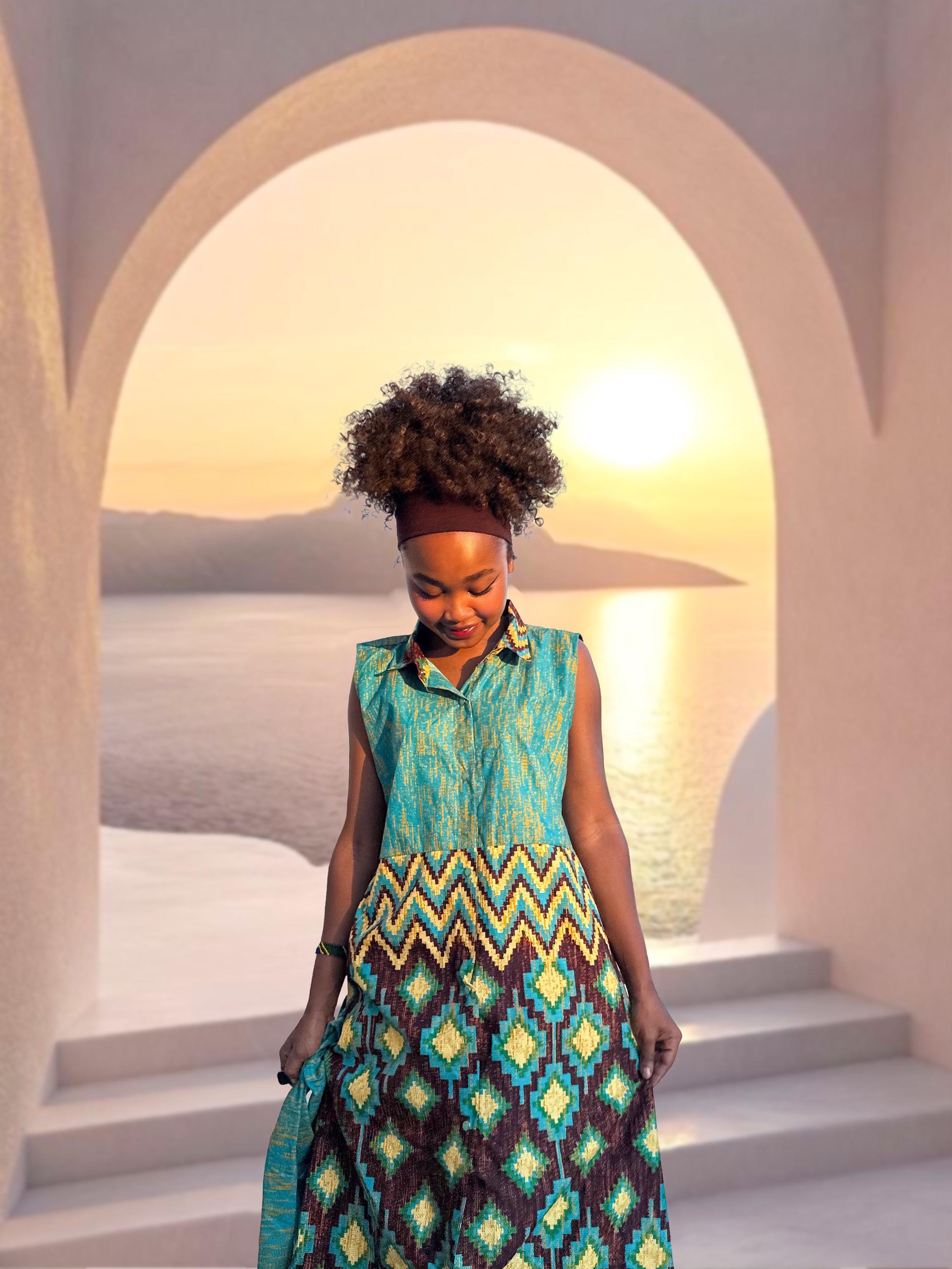 This sleeveless African print dress features a bold green-and-teal geometric kente design that gives the dress a fresh, modern look. The lightweight 100% cotton fabric makes it breathable and perfect for warm weather or travel. The A-line fit drapes nicely, and the matching belt allows you to switch between a fitted and relaxed look.