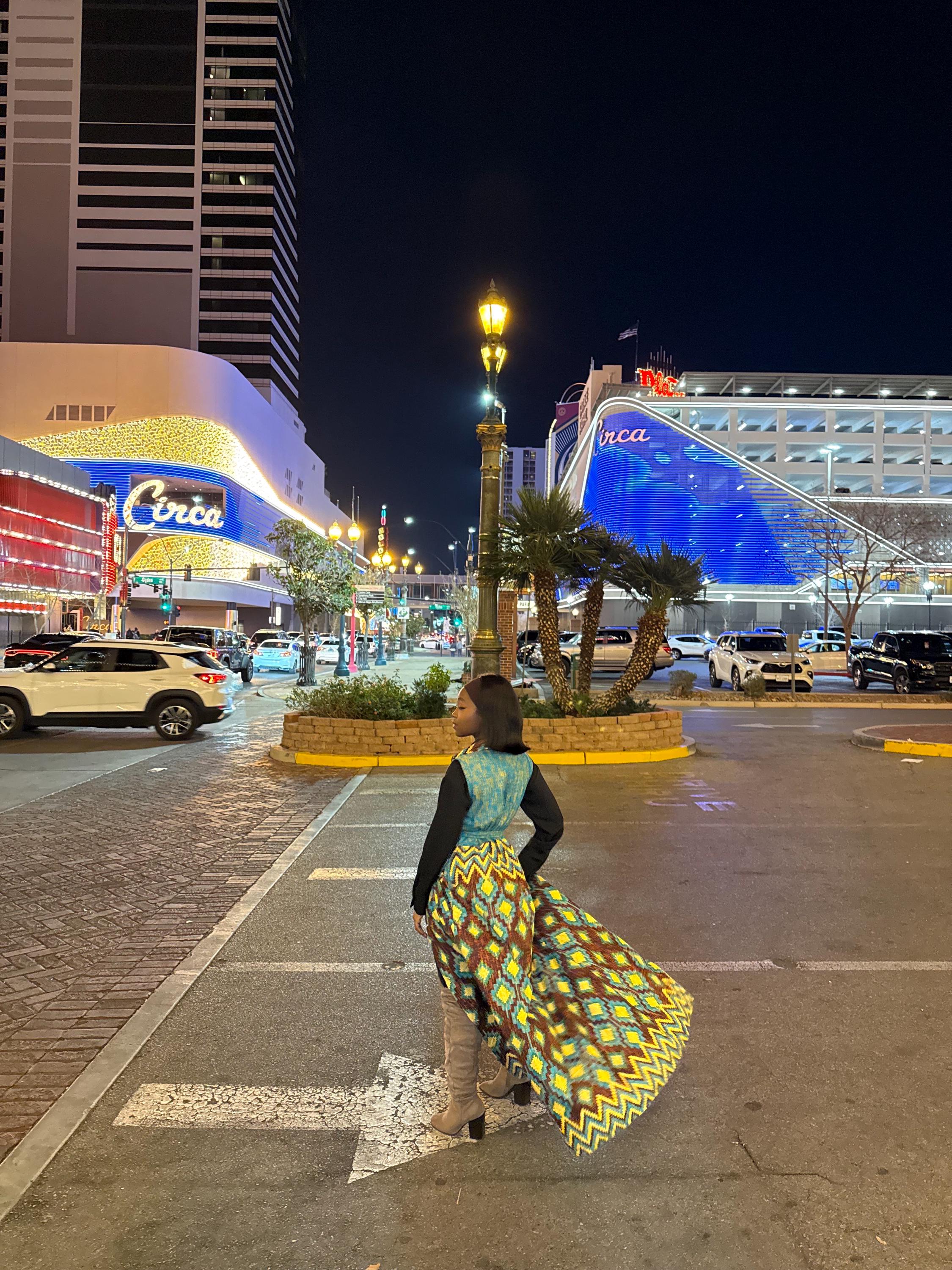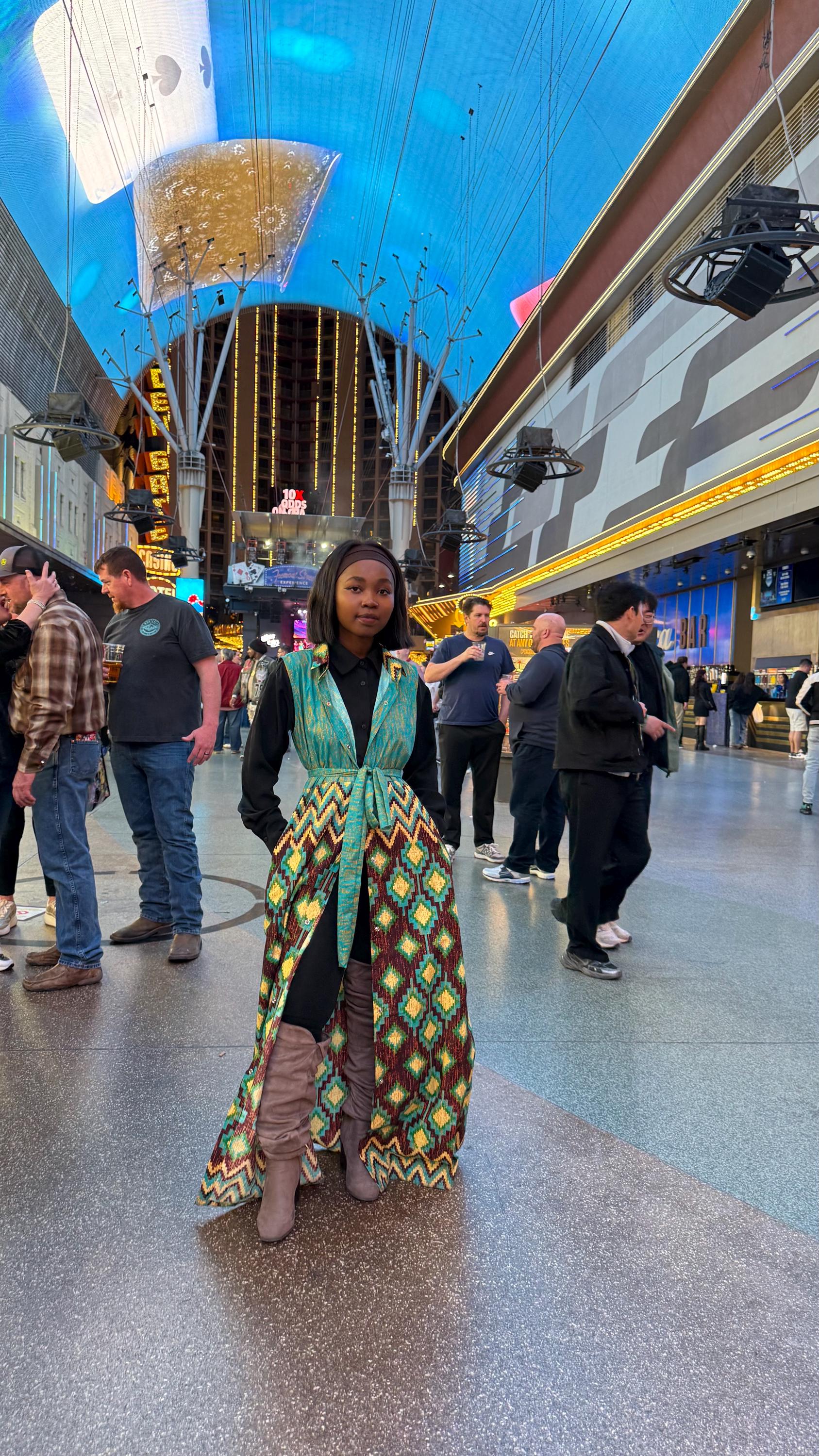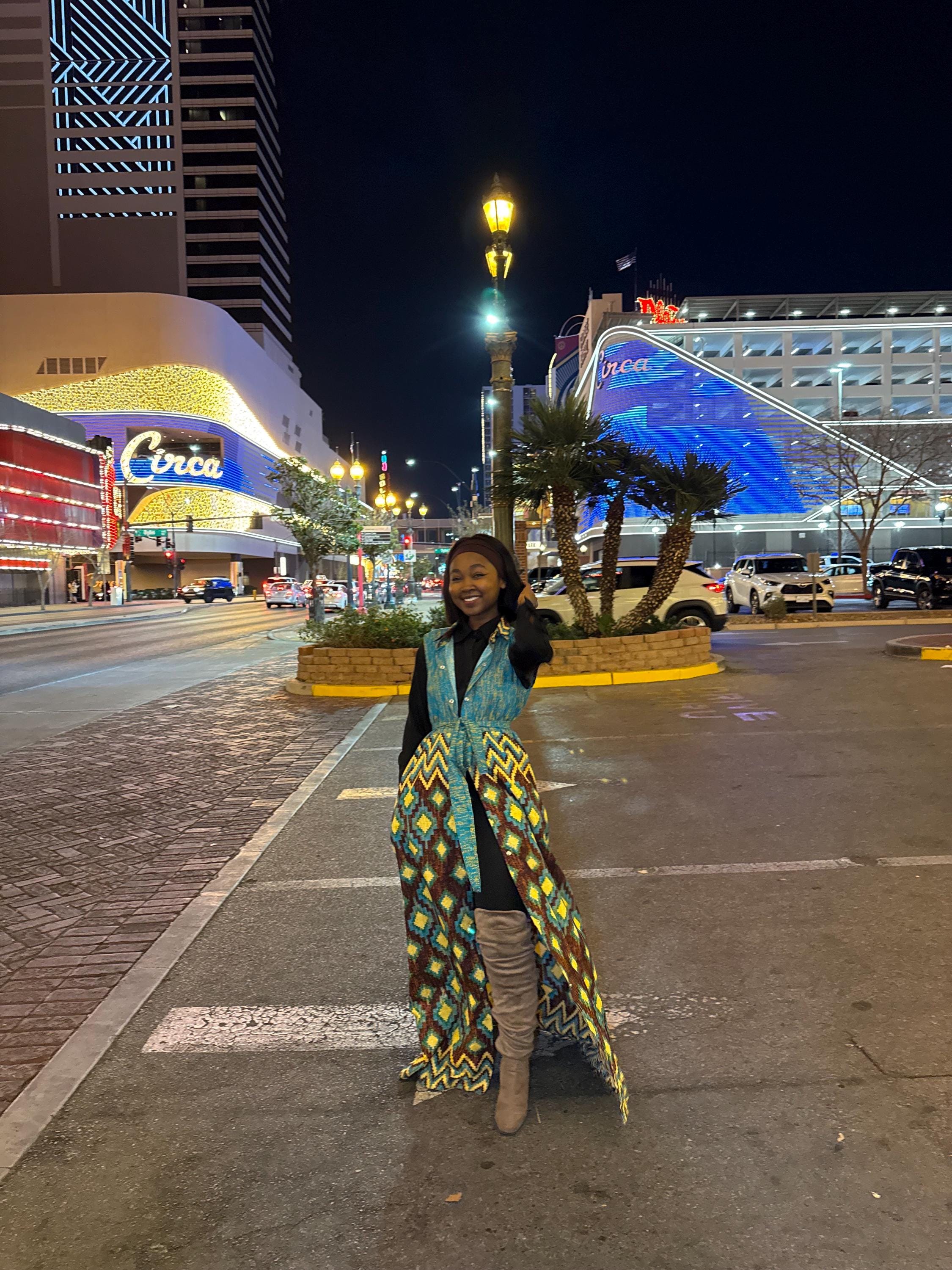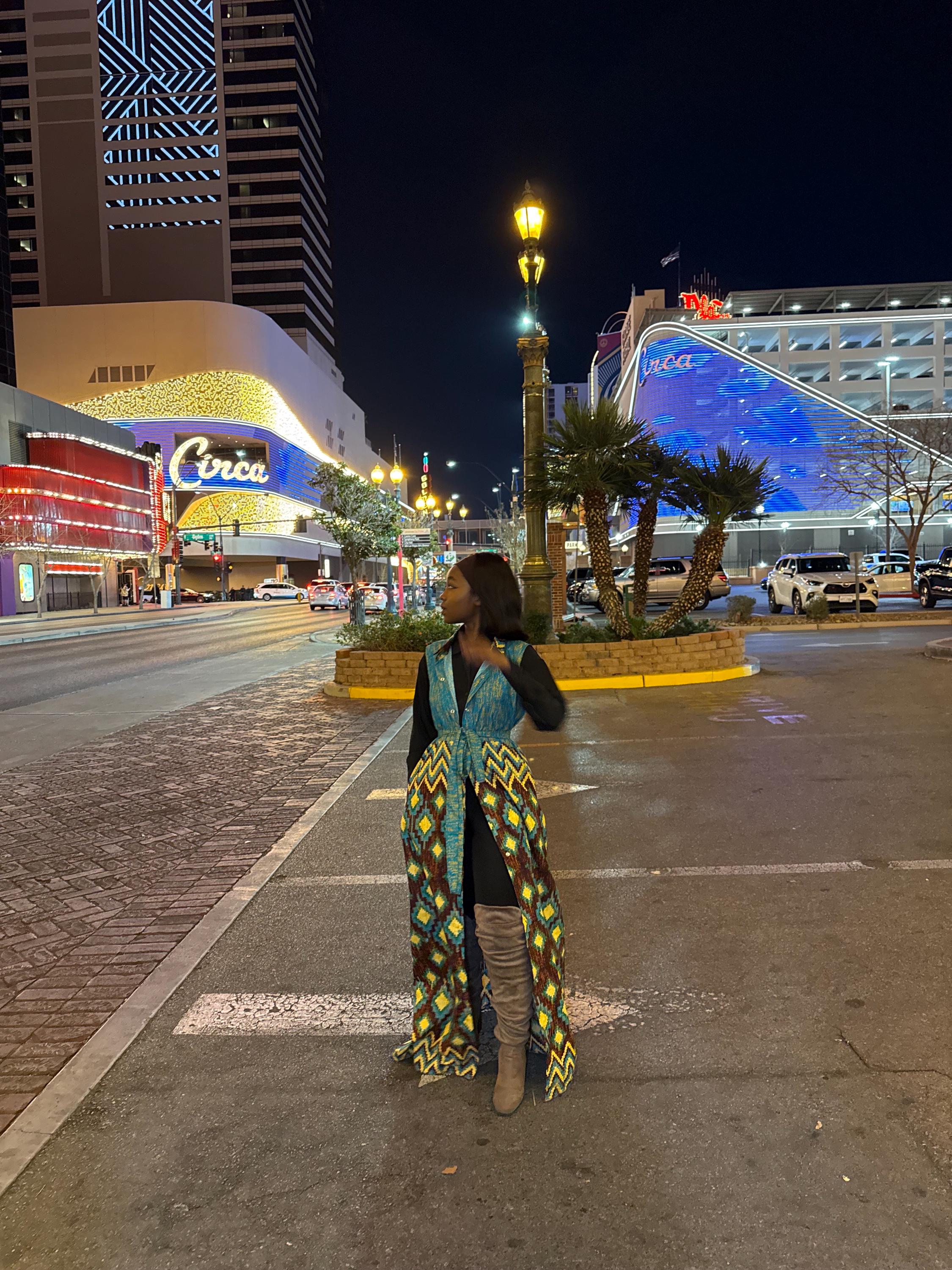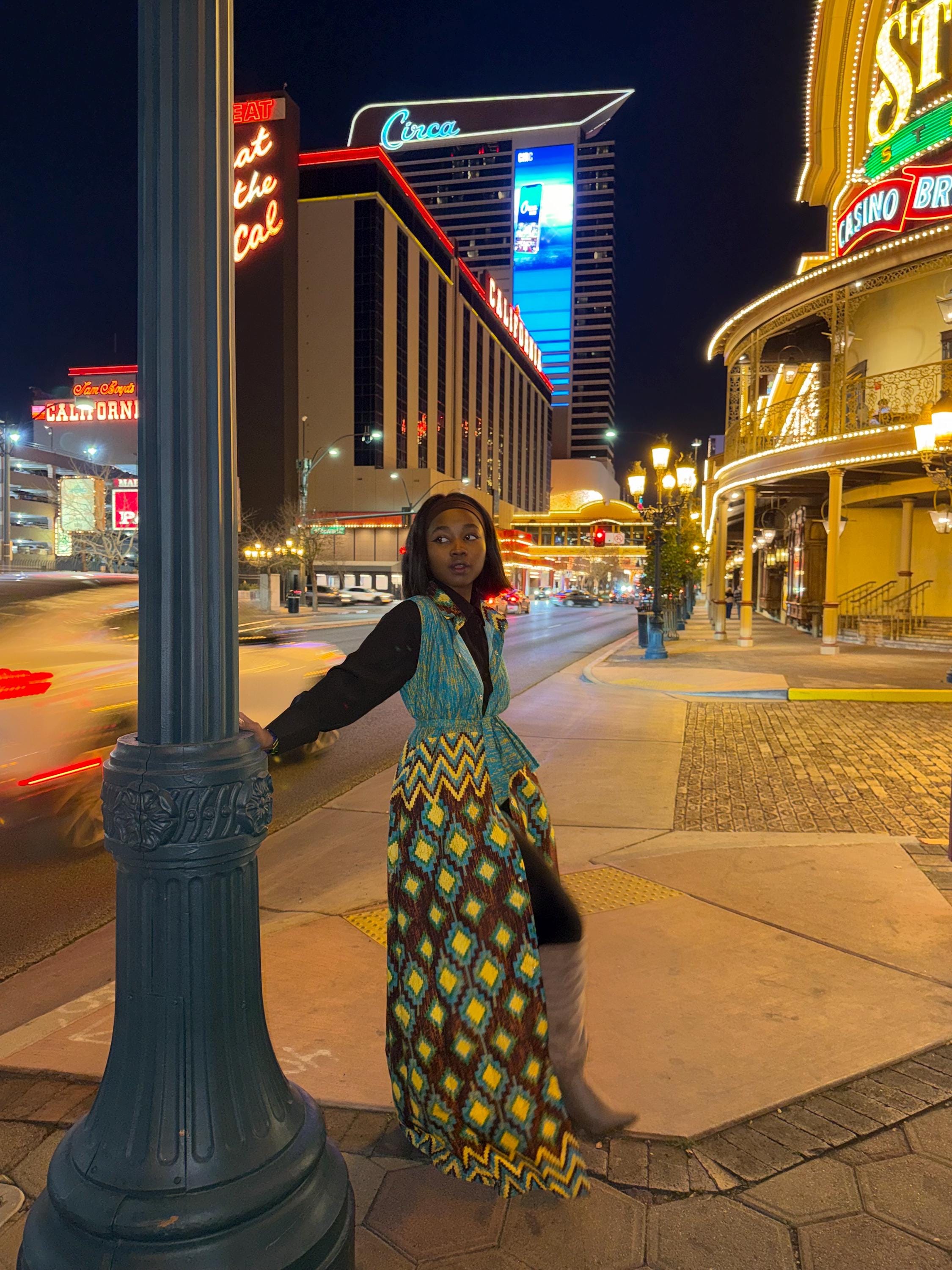 This sleeveless African print dress features a bold green-and-teal geometric kente design that gives the dress a fresh, modern look. The lightweight 100% cotton fabric makes it breathable and perfect for warm weather or travel. The A-line fit drapes nicely, and the matching belt allows you to switch between a fitted and relaxed look.