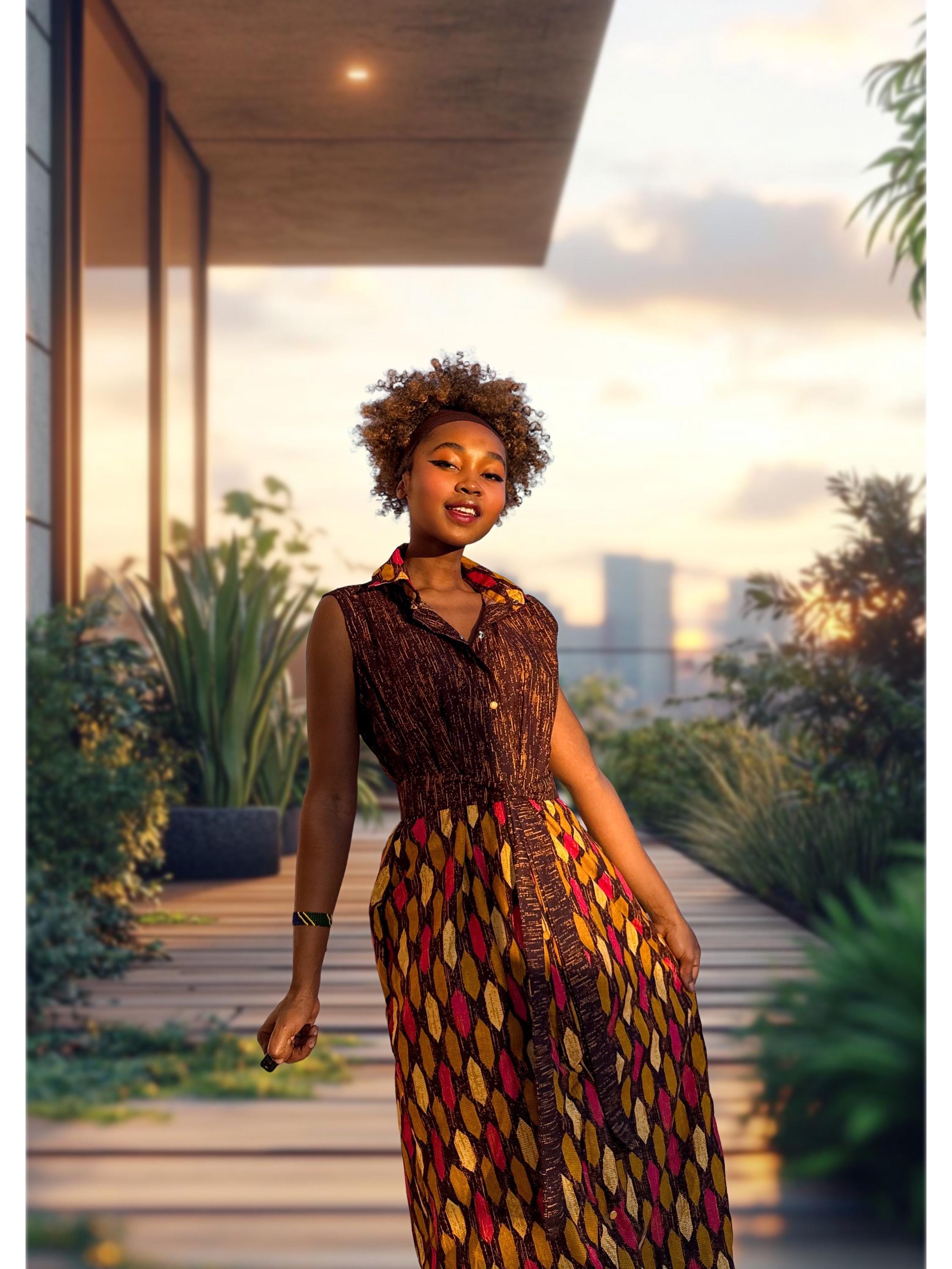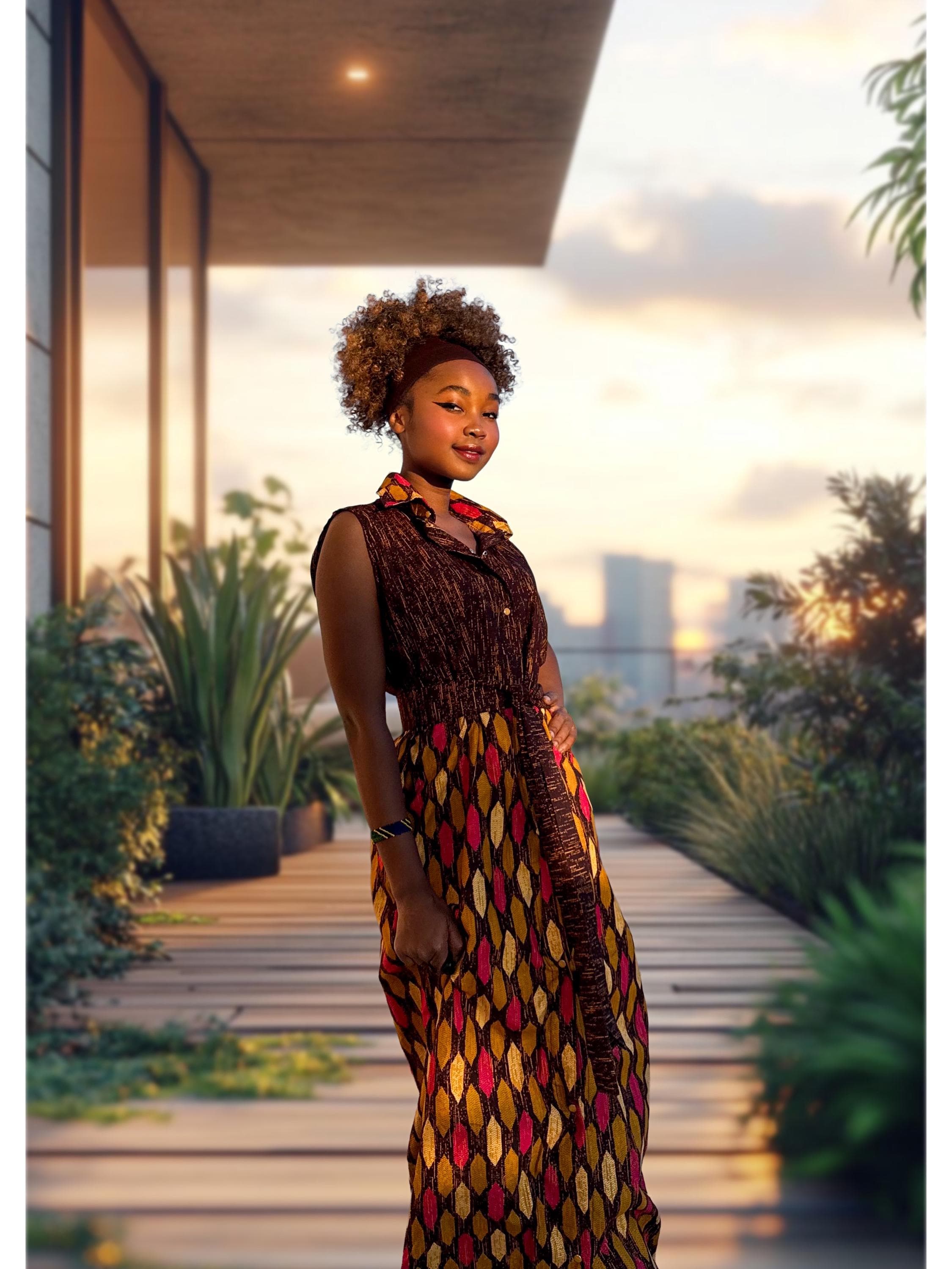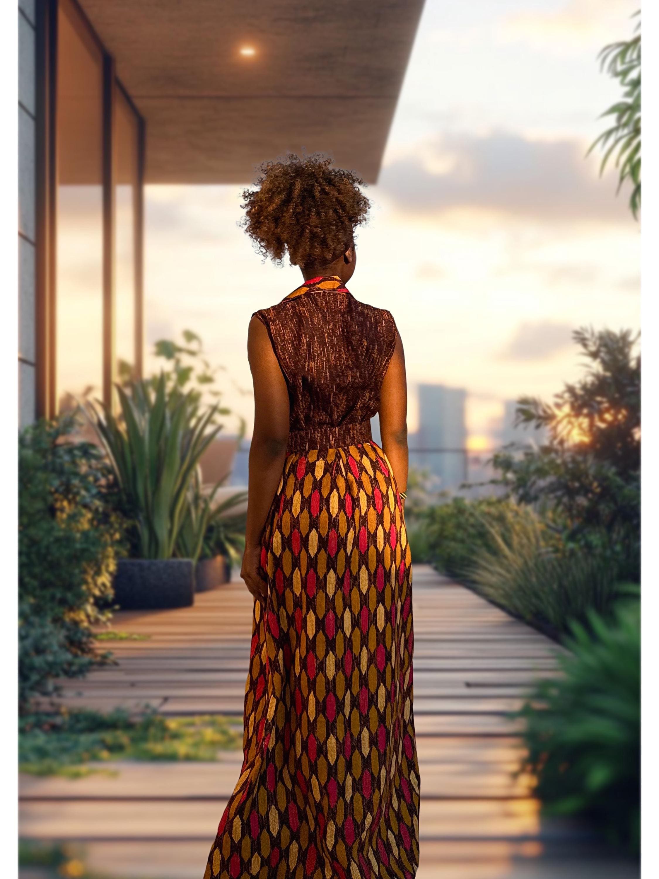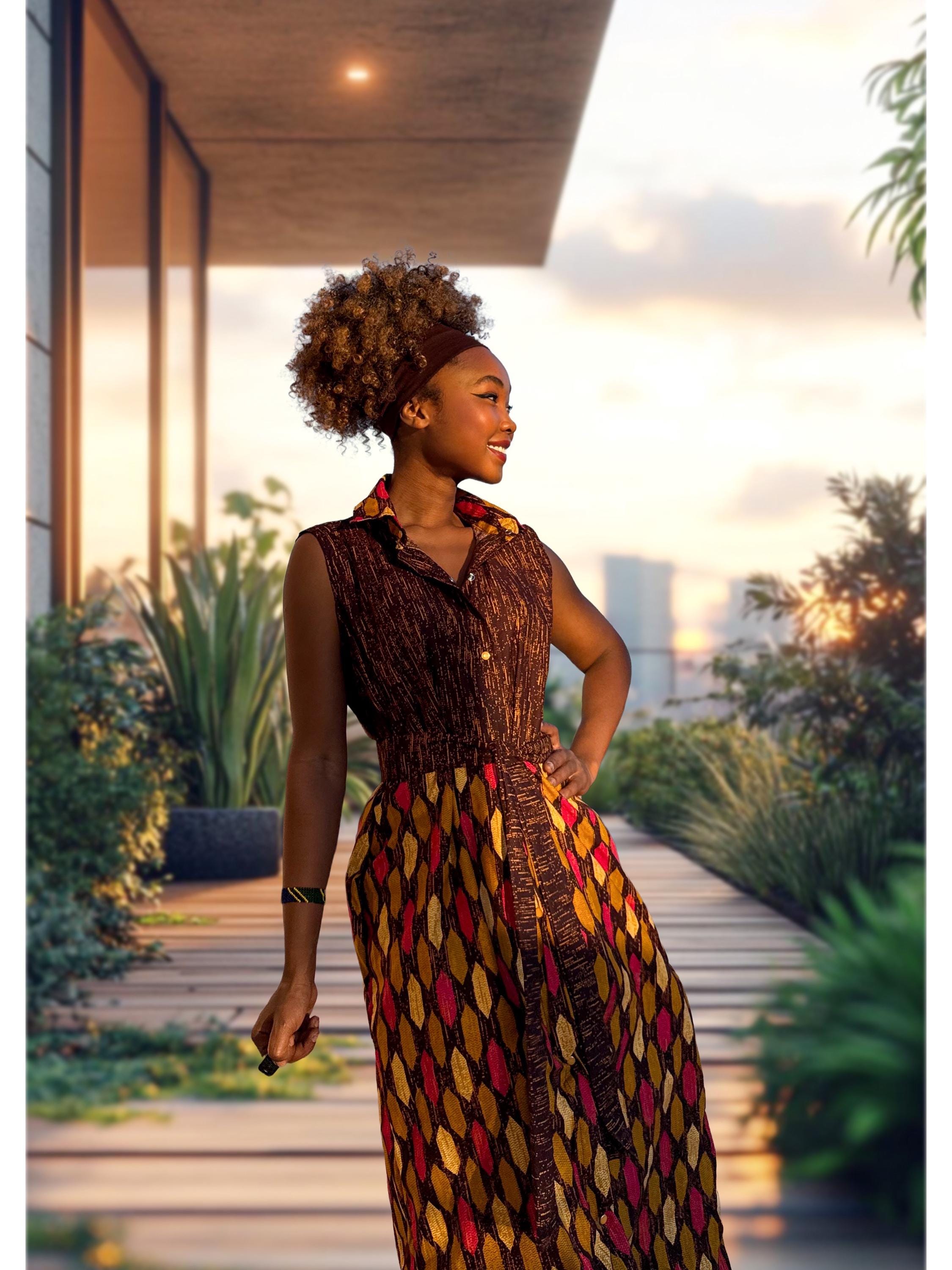 This maxi pairs a warm brown textured bodice with a bold mustard-and-magenta elongated leaf print on the skirt. The result is a rich, earthy look with a bright pop of color. It’s cut from soft 100% cotton kitenge for breathability and comfort. The sleeveless, flowy shape is easy to wear; use the matching belt for a more defined waist or skip it for a relaxed silhouette.