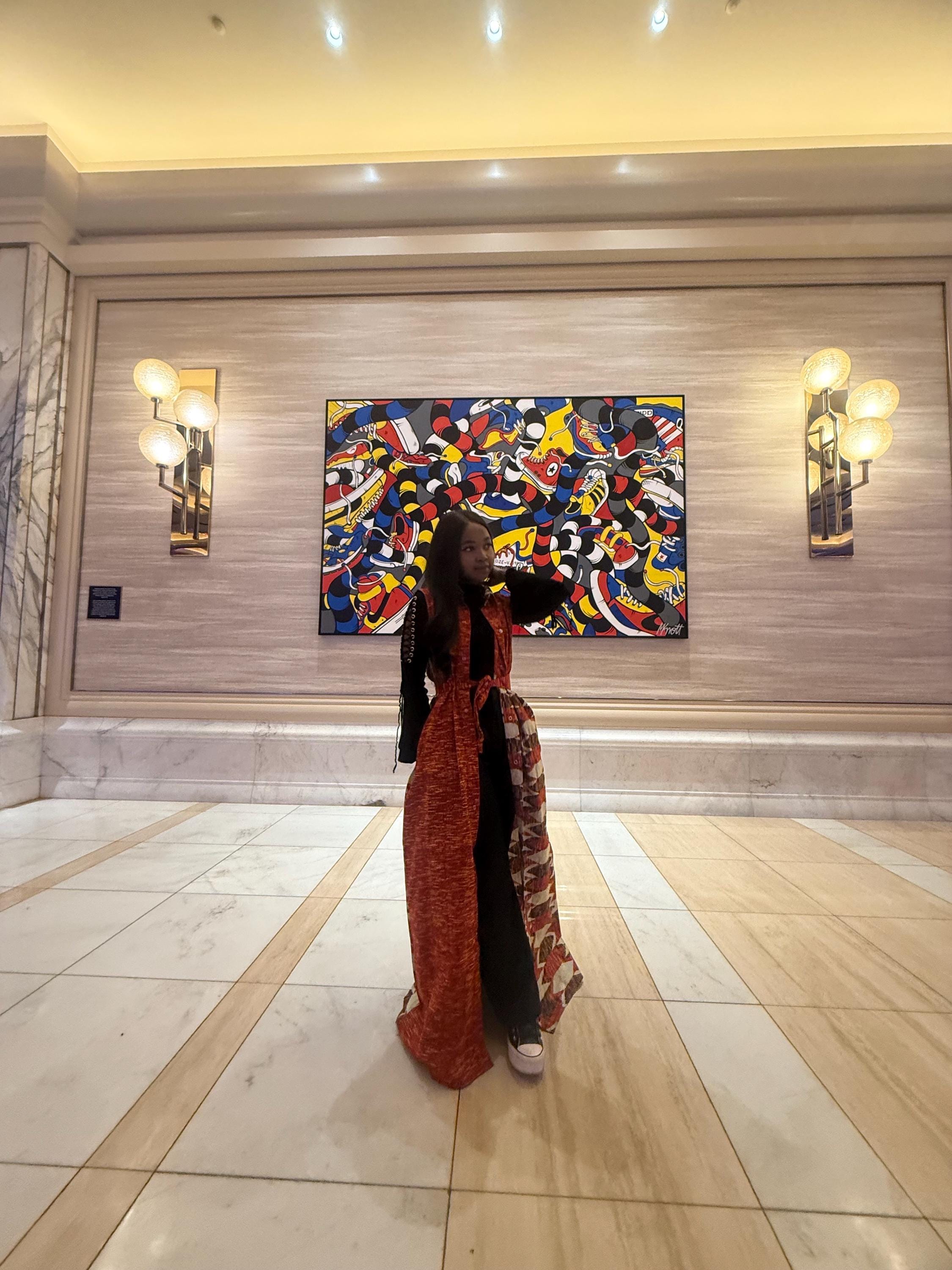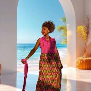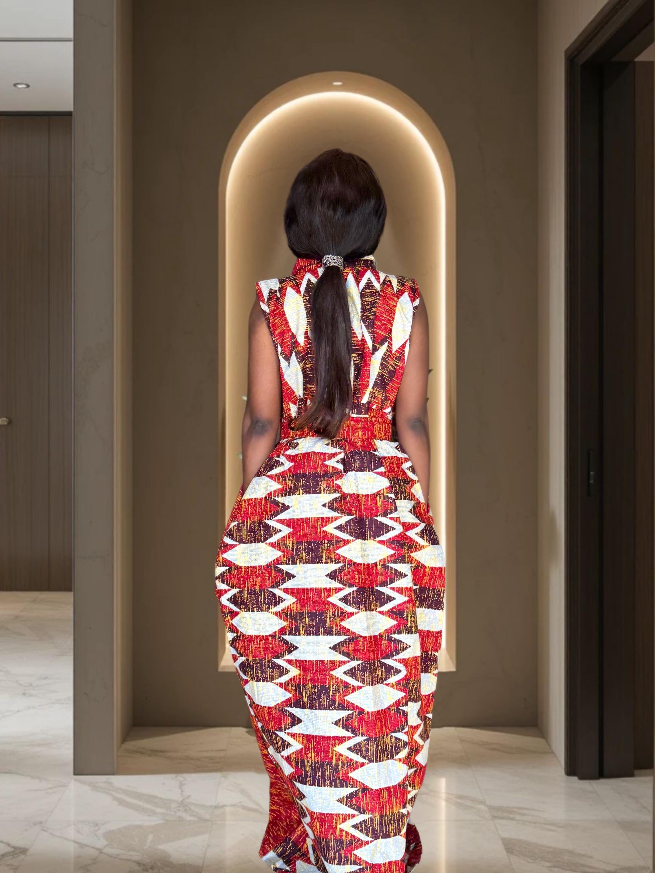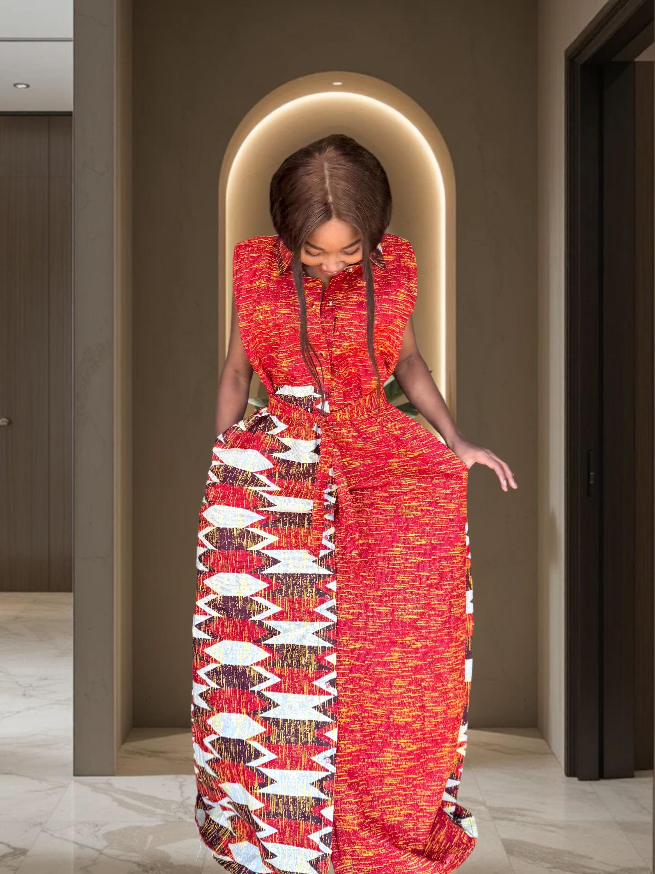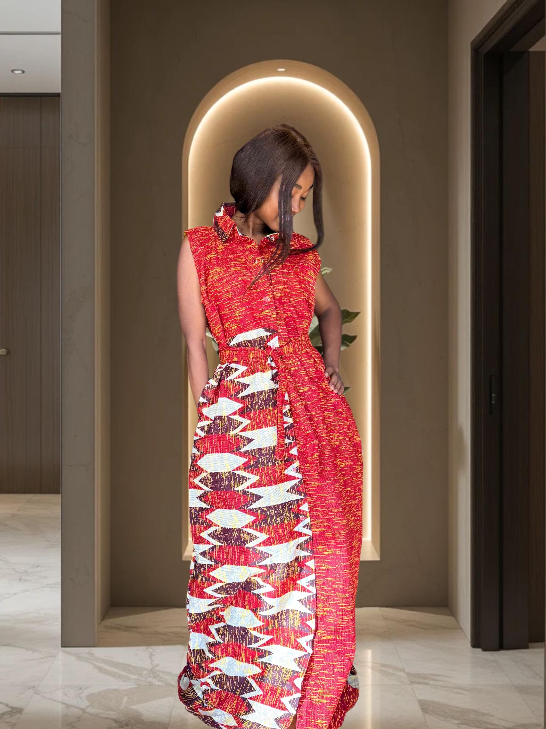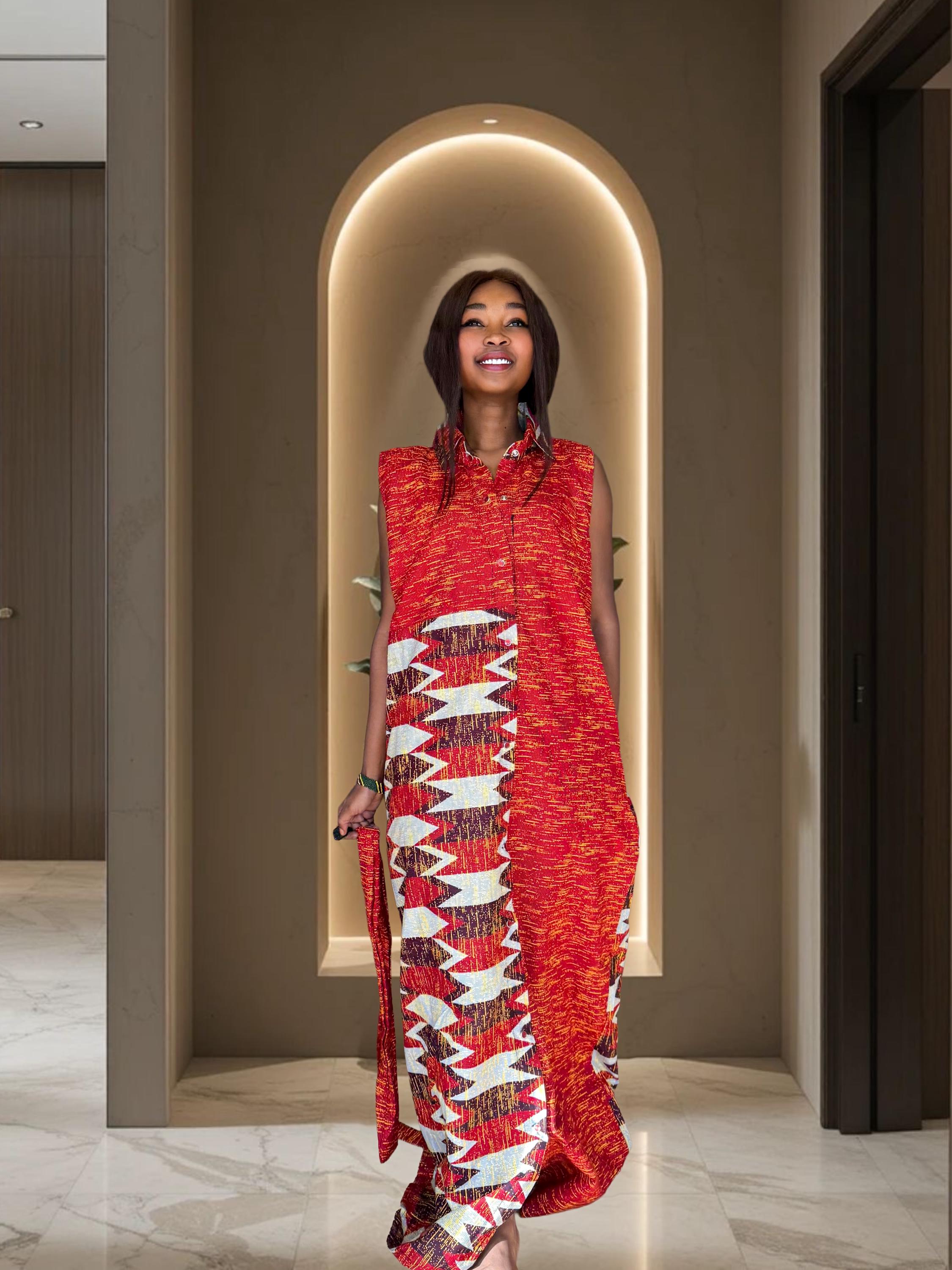 This sleeveless maxi dress features a vibrant red textured print paired with a bold white, yellow, and deep-maroon geometric side panel that gives it a striking, modern look. Made from soft, breathable 100% cotton kitenge, it drapes comfortably with an easy A-line fit. Wear it loose for an airy feel or use the matching waist tie to shape your silhouette.