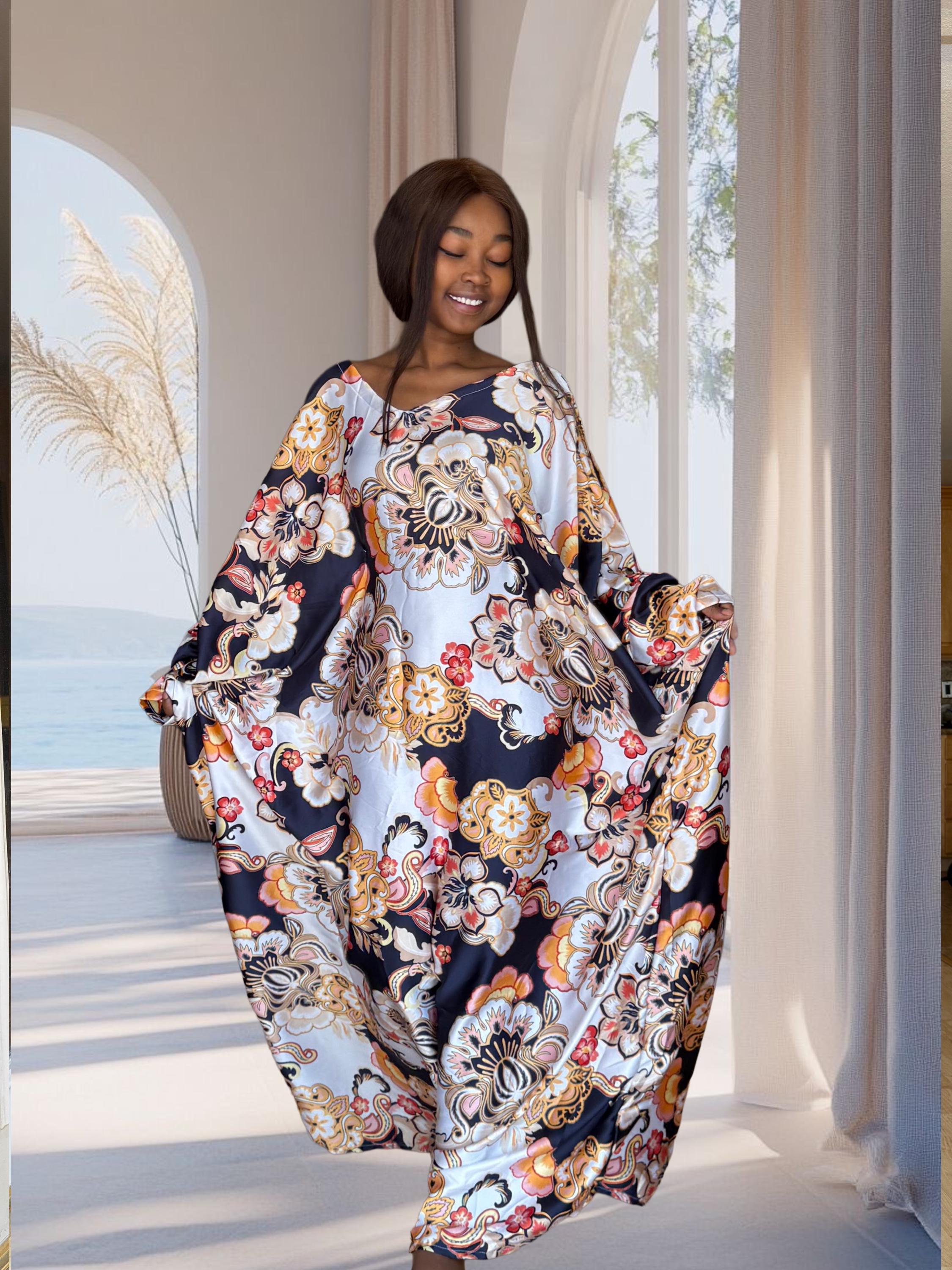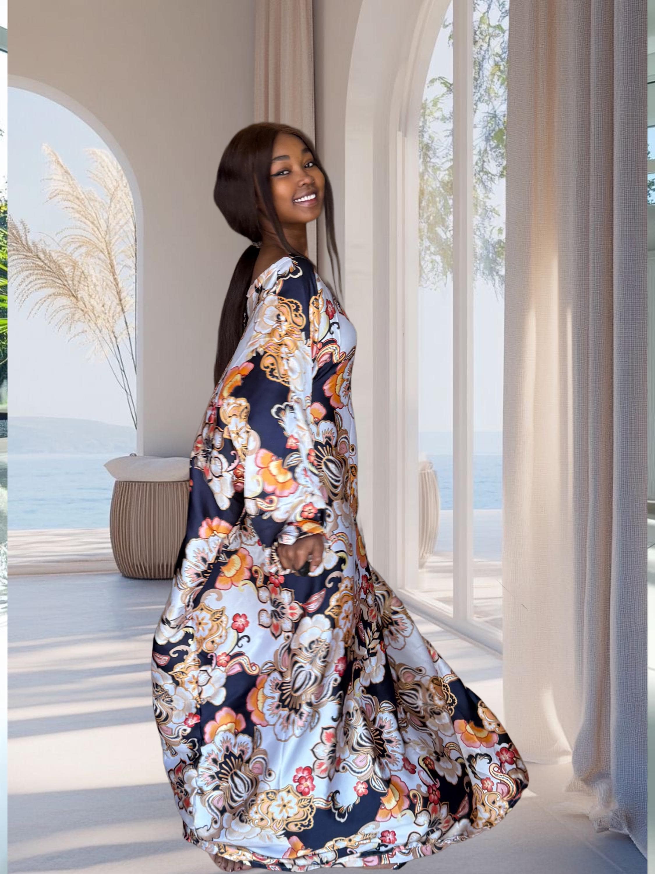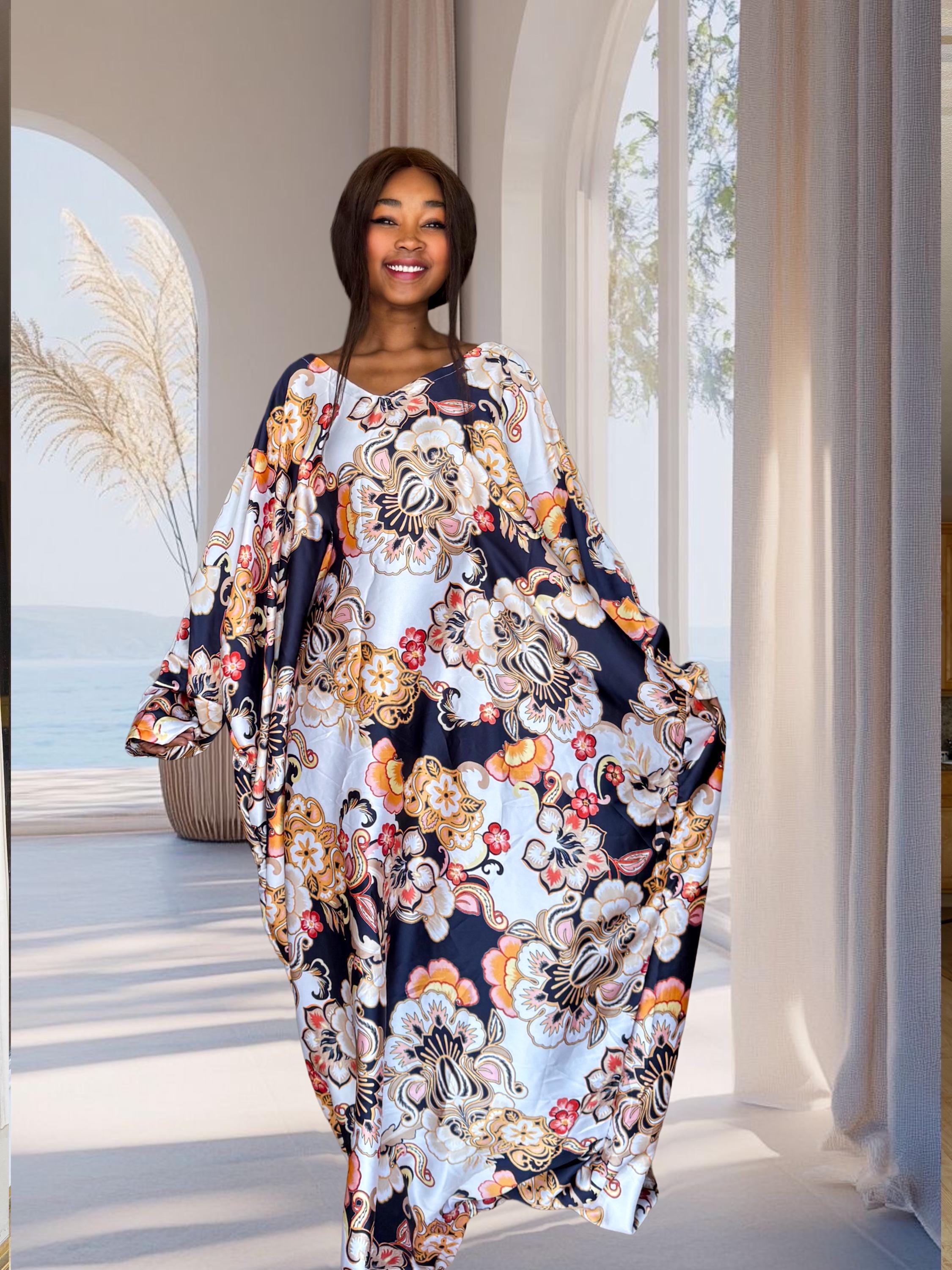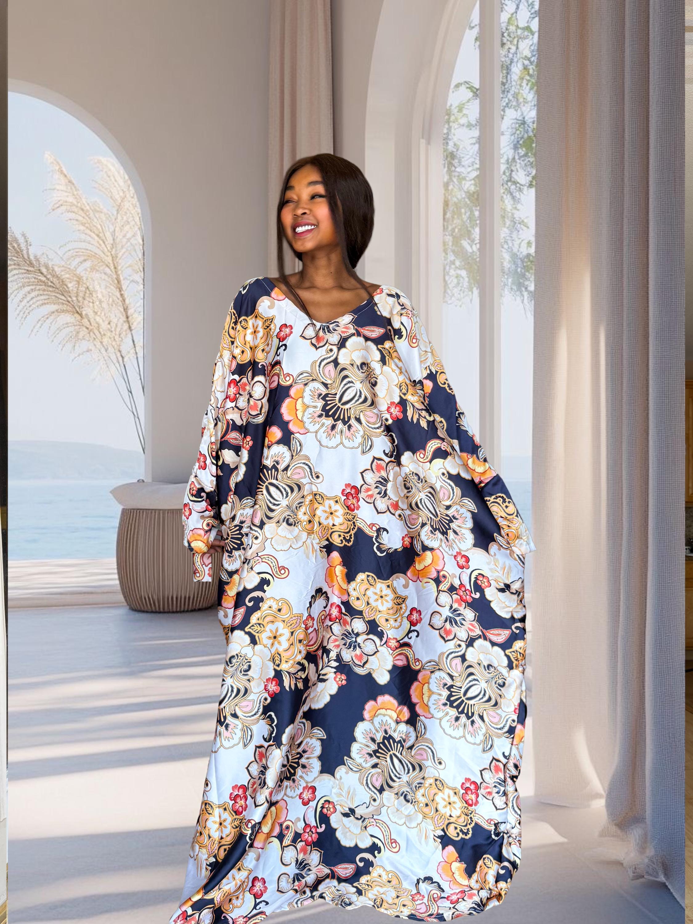 This navy floral kaftan blends soft satin flow with a bold, high-end print featuring gold and cream floral artwork. It’s the perfect mix of modern glamour and traditional African craftsmanship. Designed to fit sizes S to 2XL, it transitions effortlessly from events to everyday elegance.