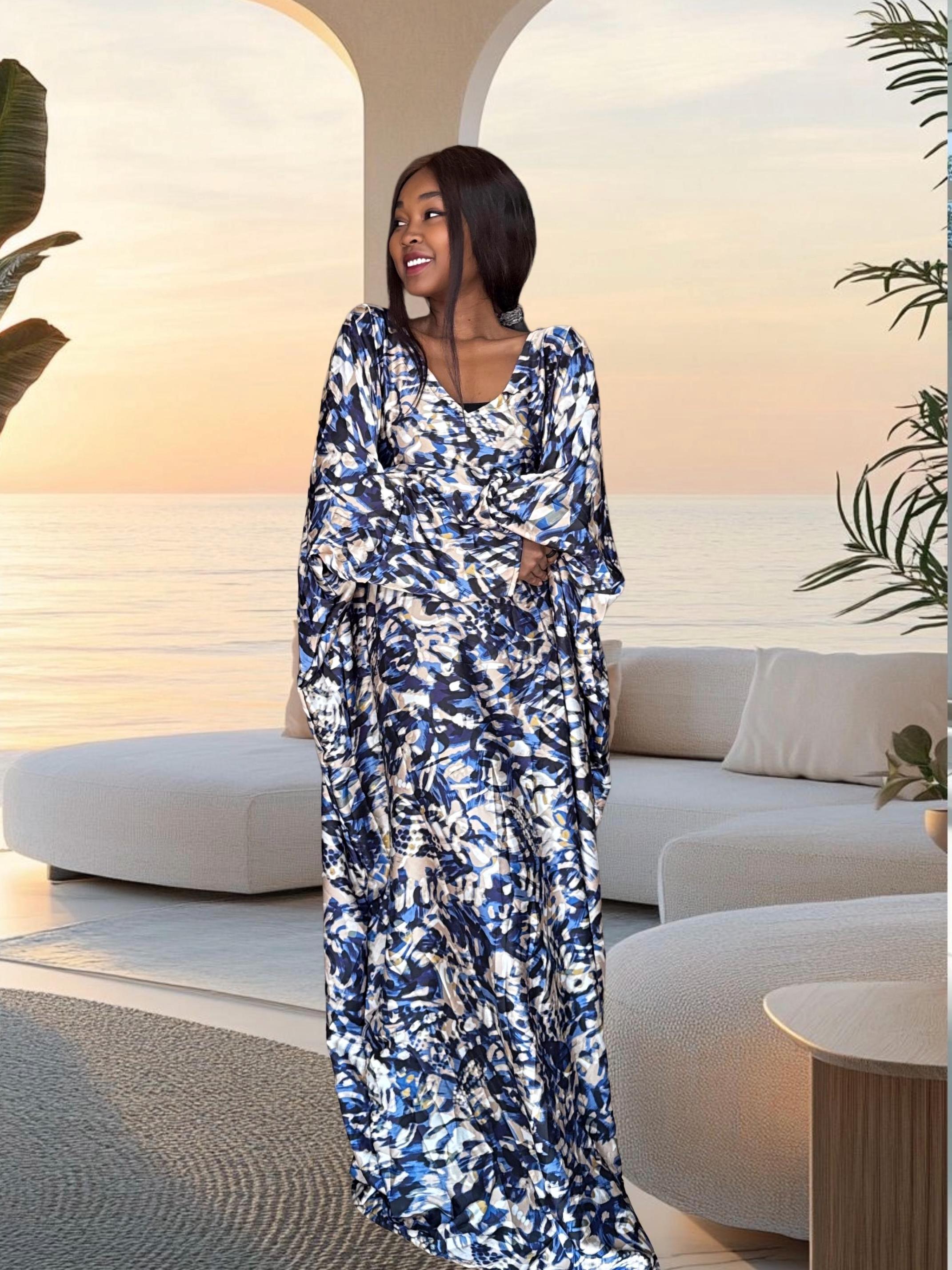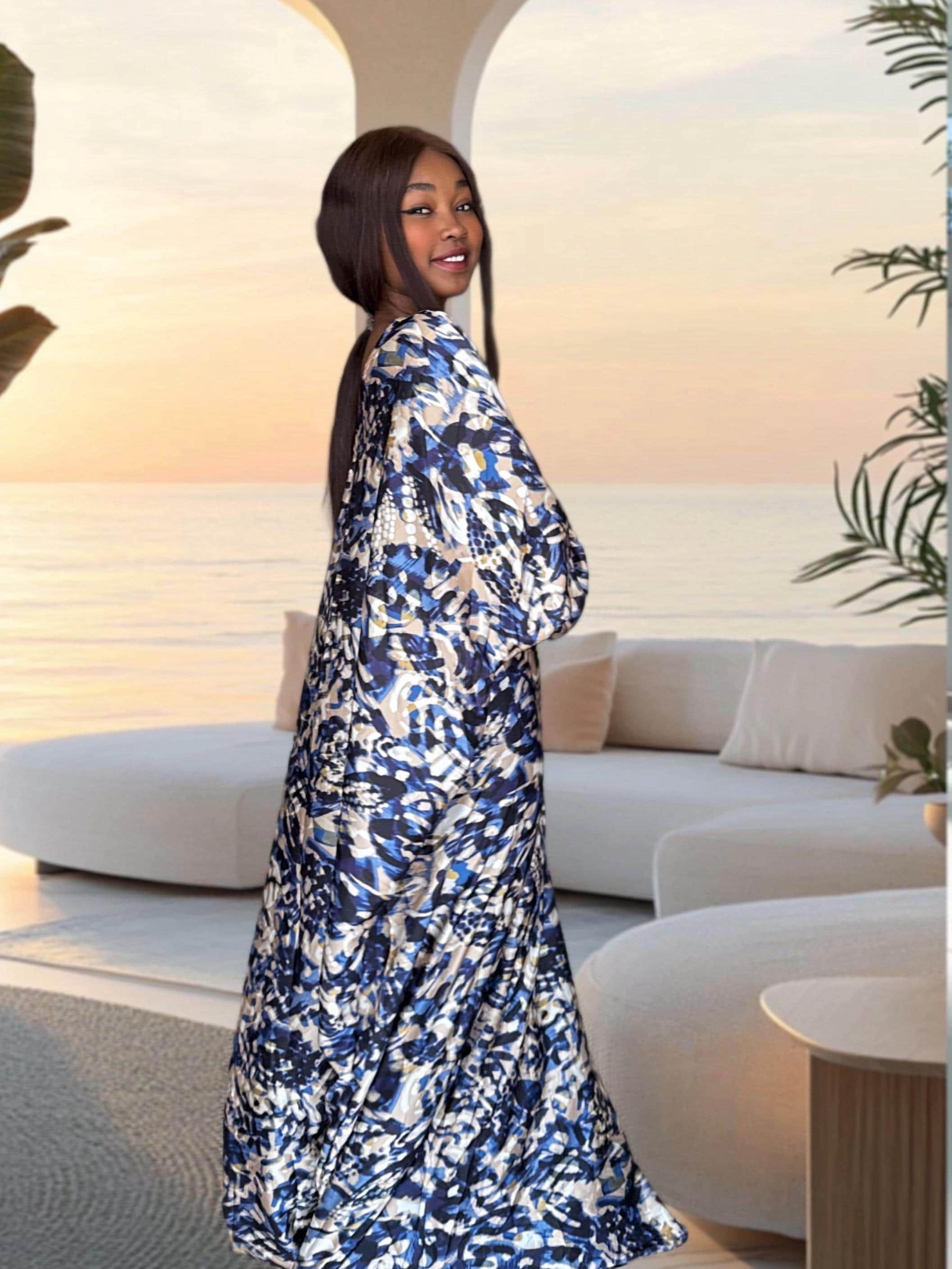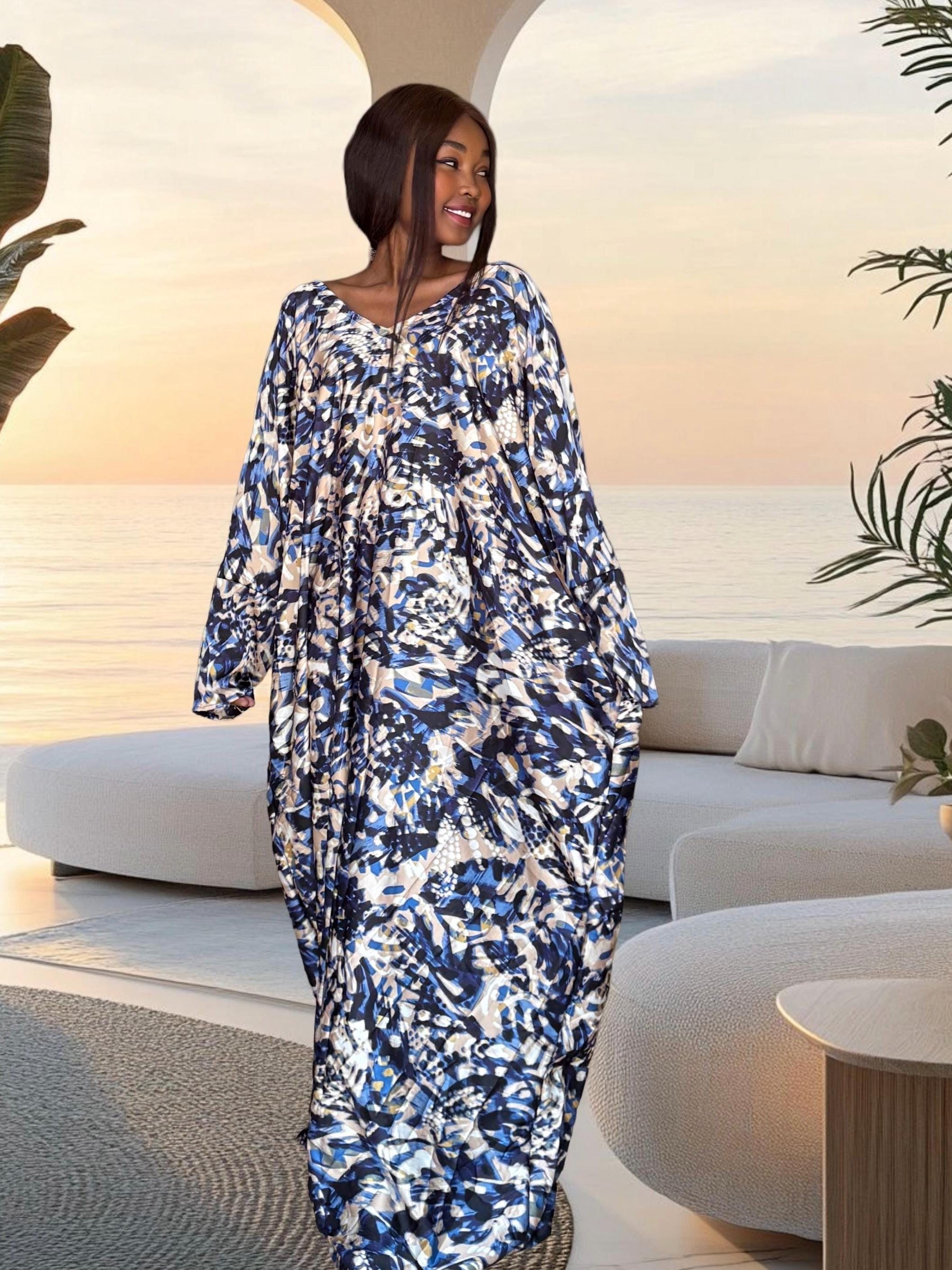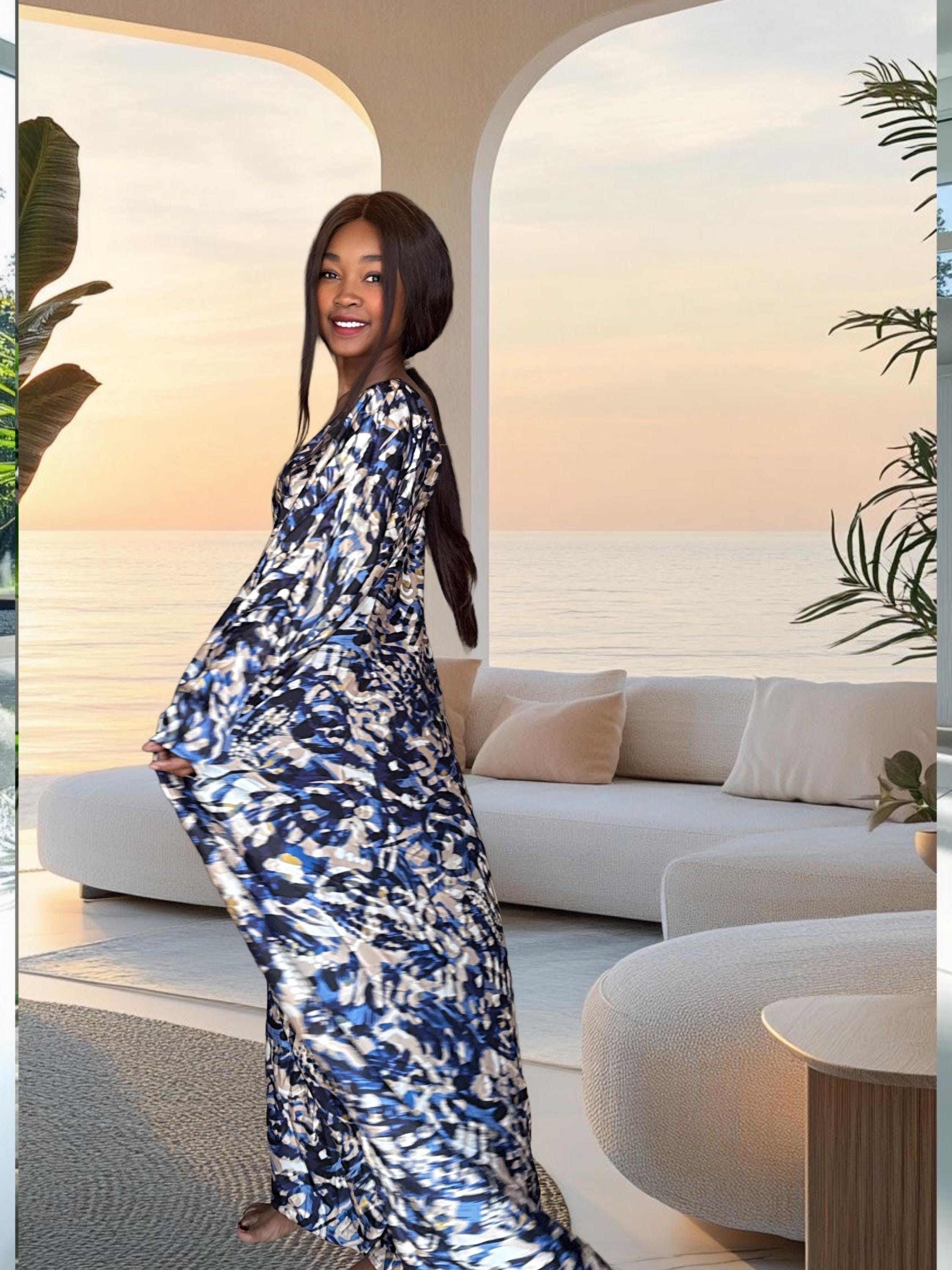 This handmade African bubu dress features a beautiful blue abstract wave print with soft cream and navy tones. The pattern gives a calming, ocean-inspired feel while the silhouette stays free, airy, and comfortable. The dress includes hidden inner waist ties so you can wear it loose or add a little shape at the waist.