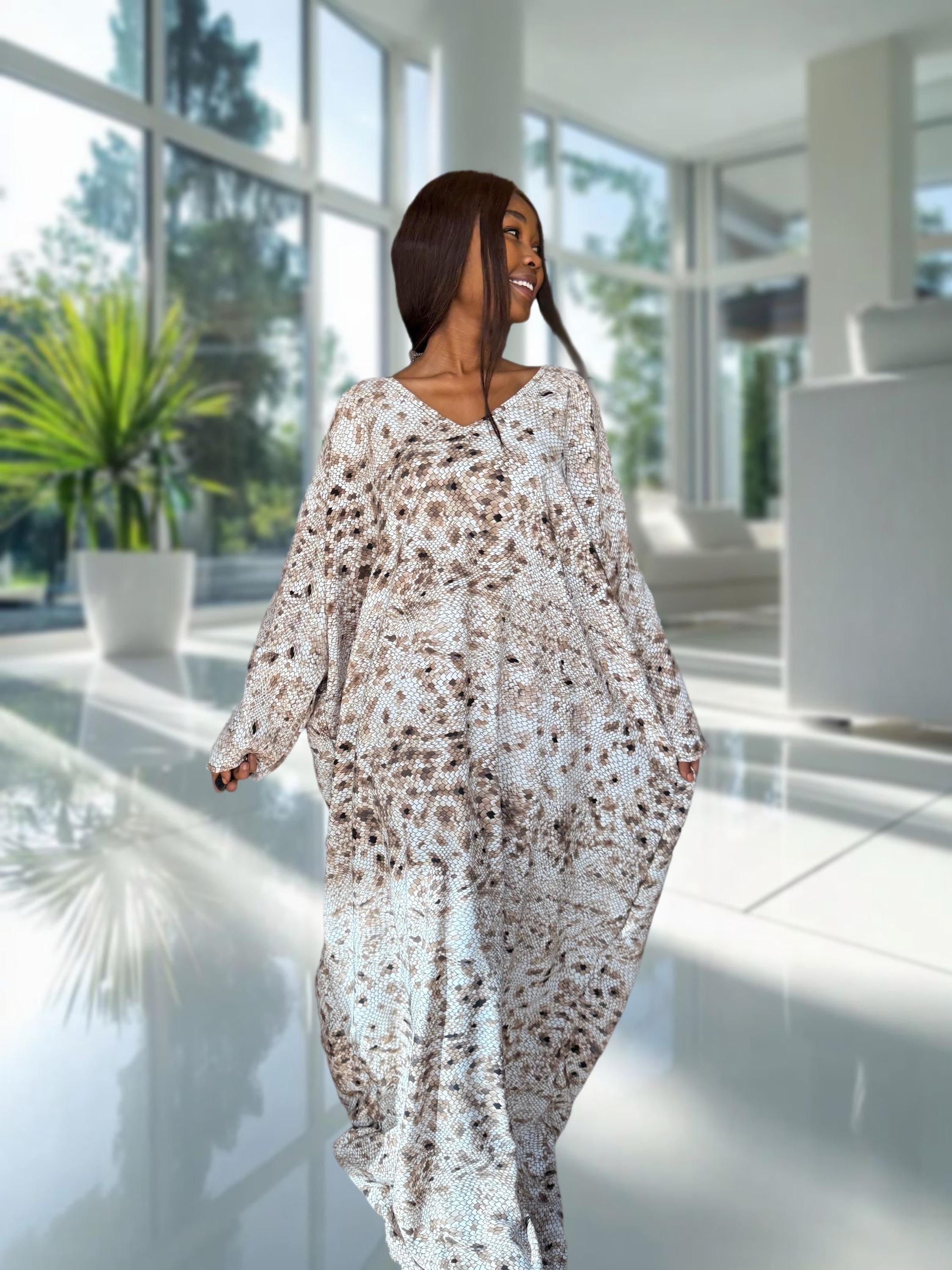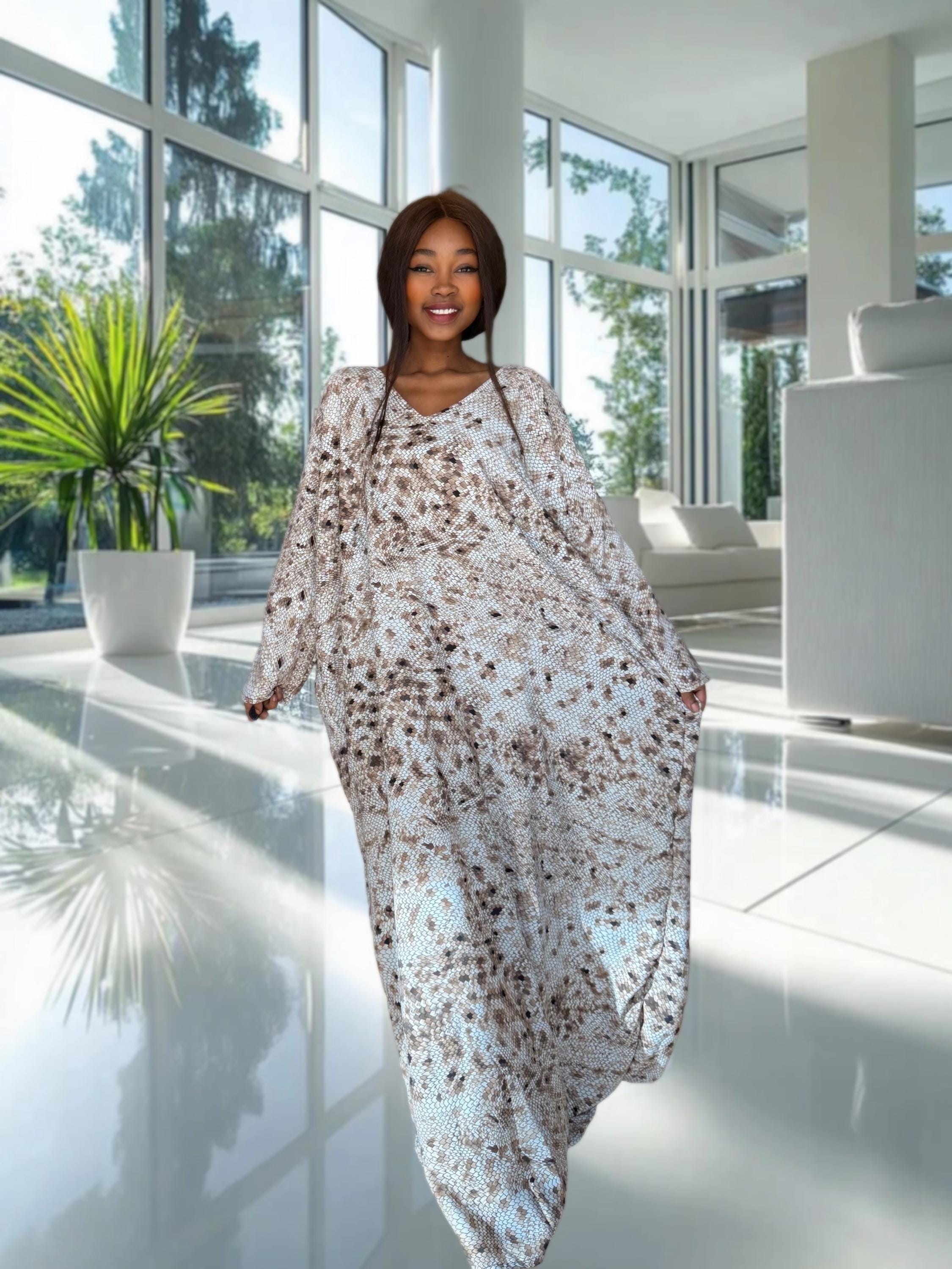 This handmade African bubu dress features a subtle light brown scale print that resembles soft snake or lizard skin—natural, earthy, and beautifully textured without being too bold. The neutral tones make it an easy everyday piece while still giving that elevated, unique look.
