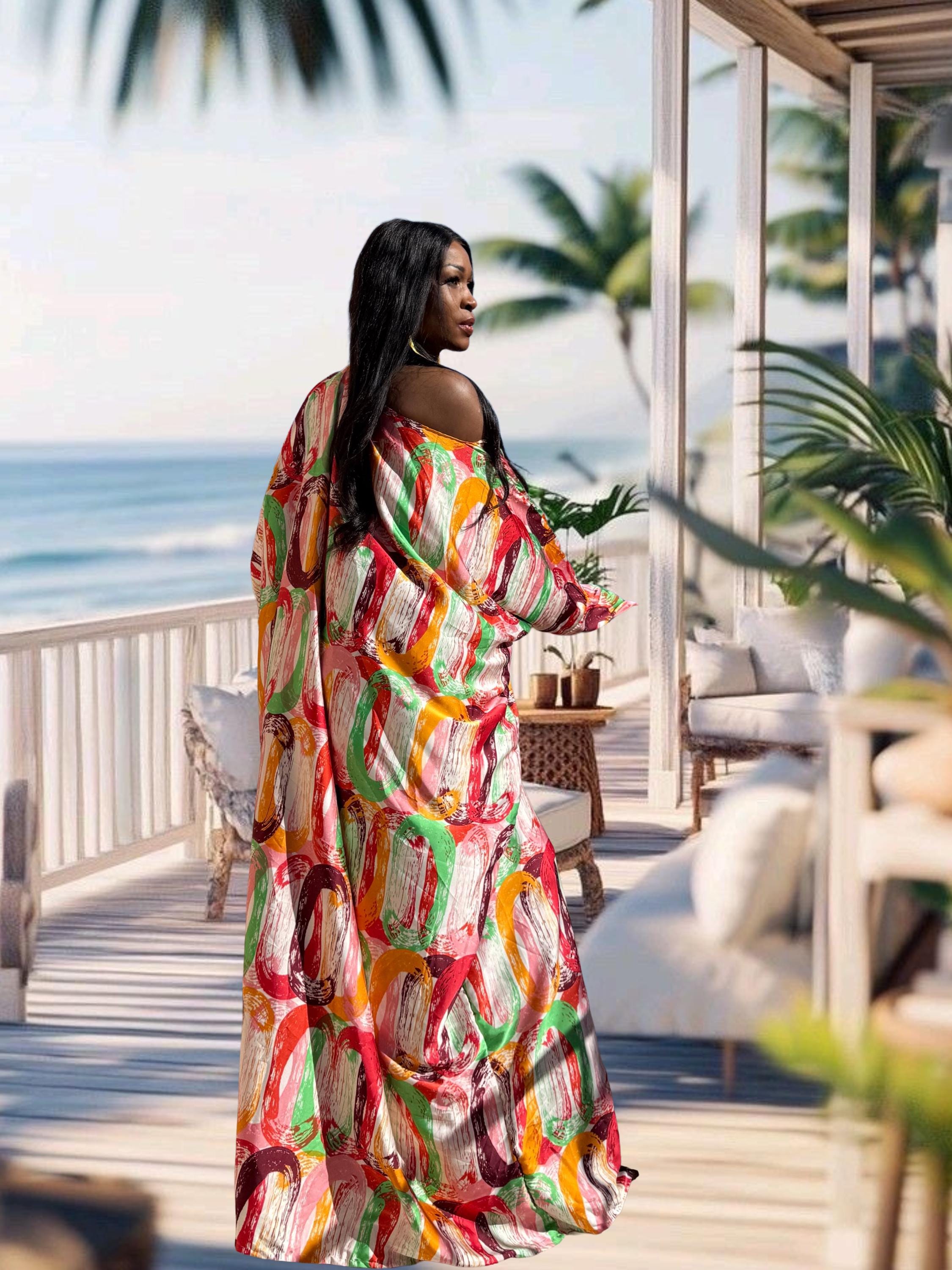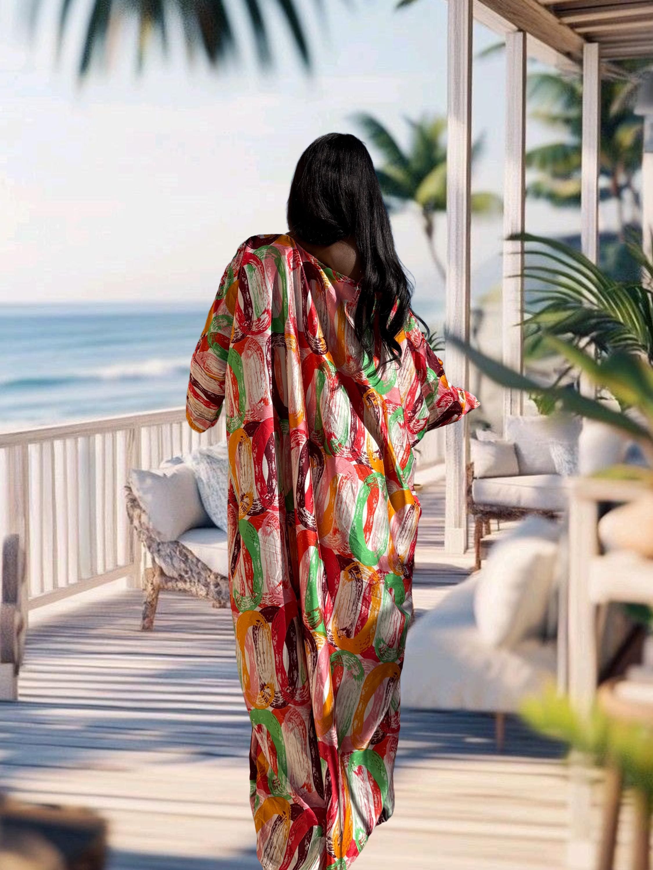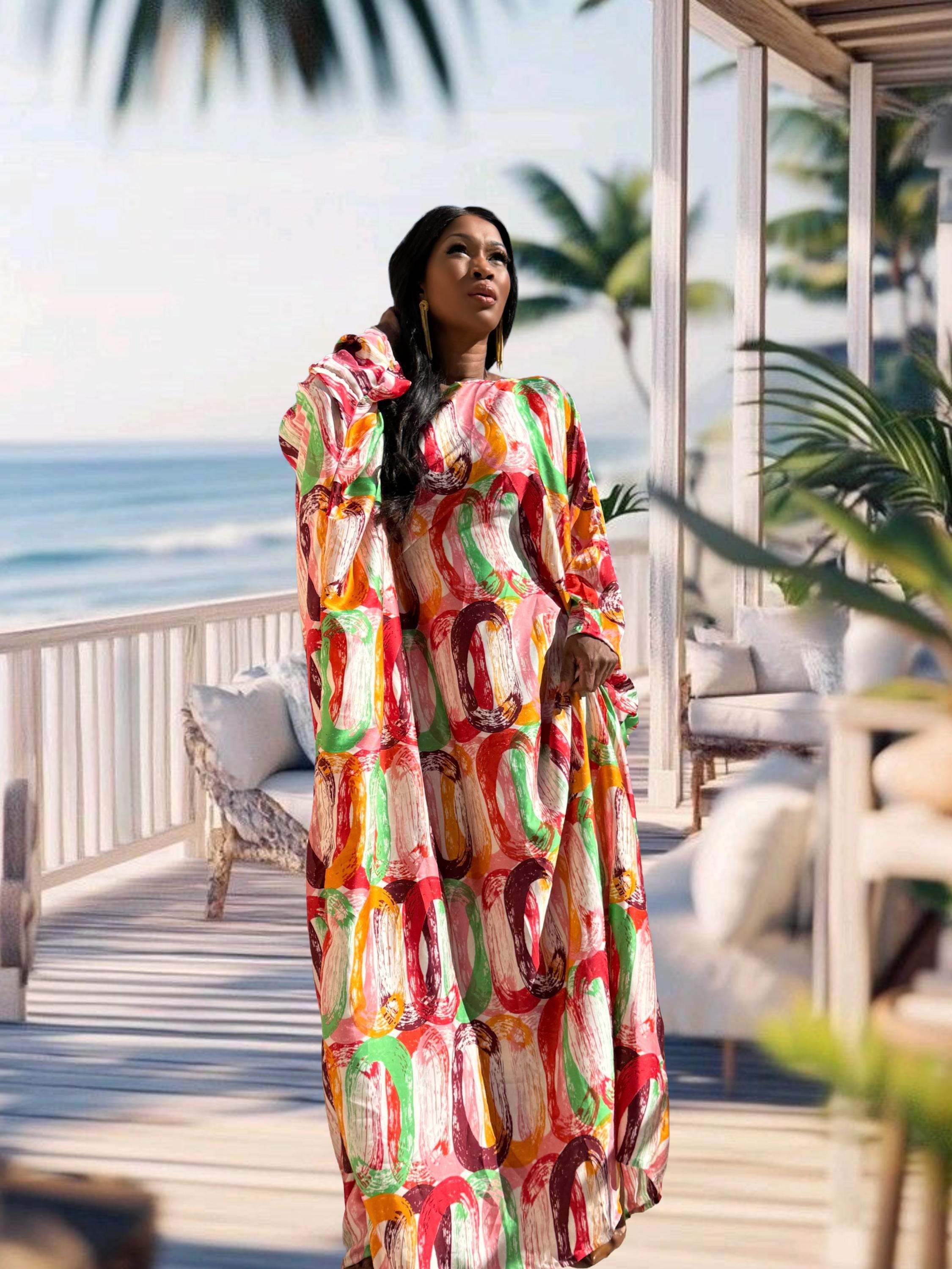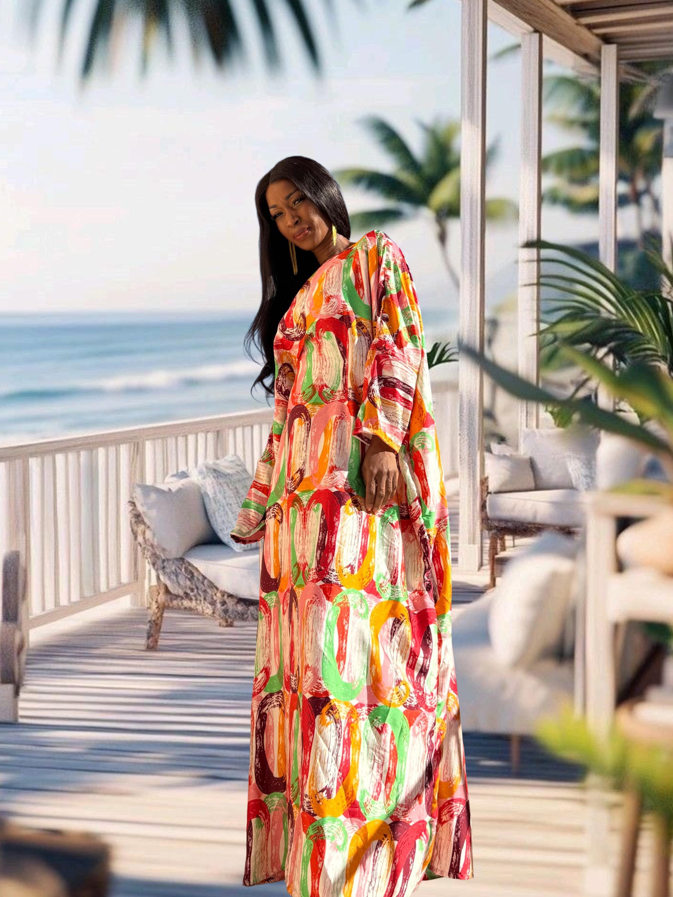 Bold, joyful, and full of life, this vibrant kaftan showcases a striking multicolor abstract pattern inspired by warmth, movement, and celebration. Featuring shades of coral, gold, green, and red, this design is made for those who love statement fashion with ease.