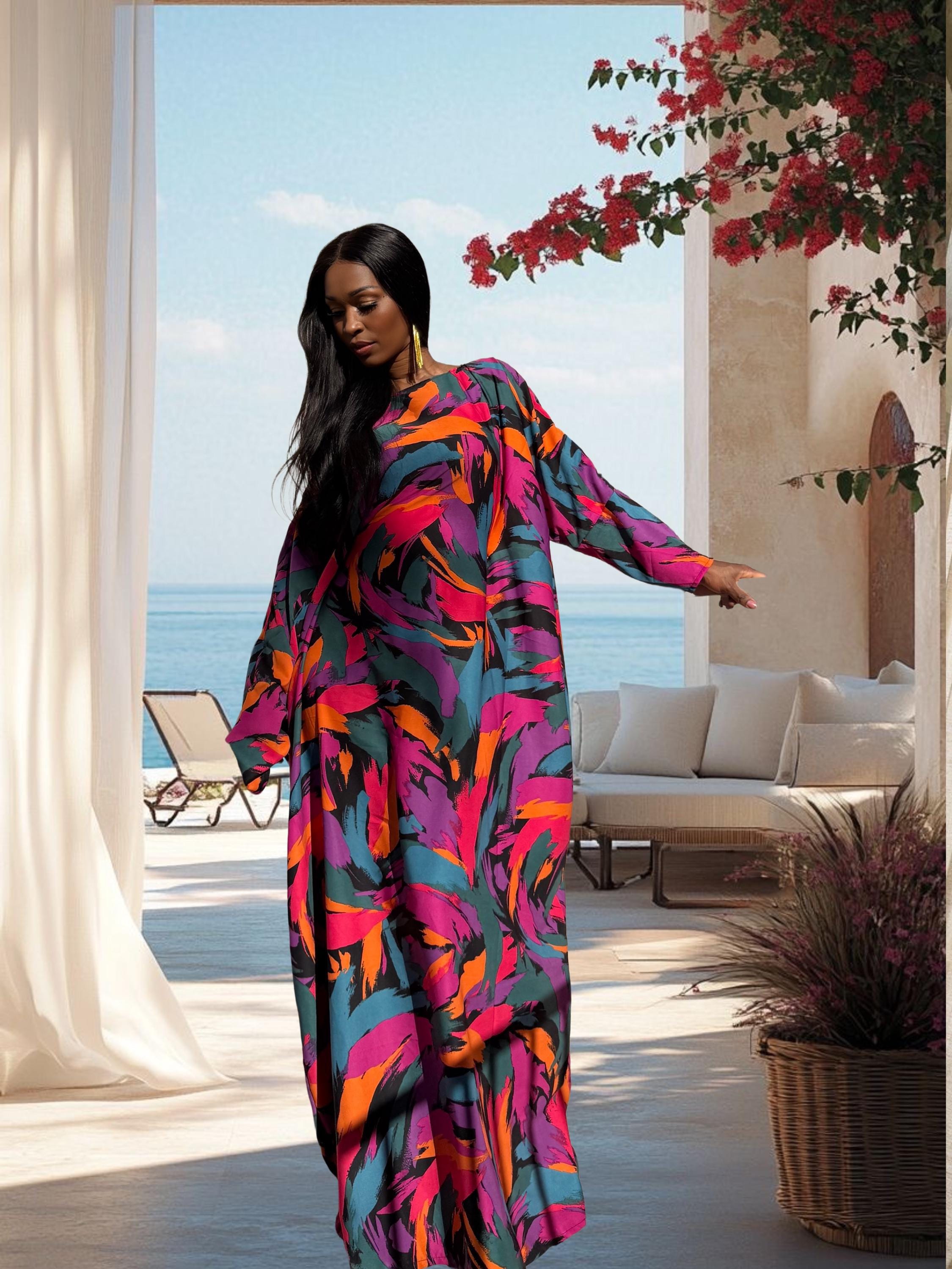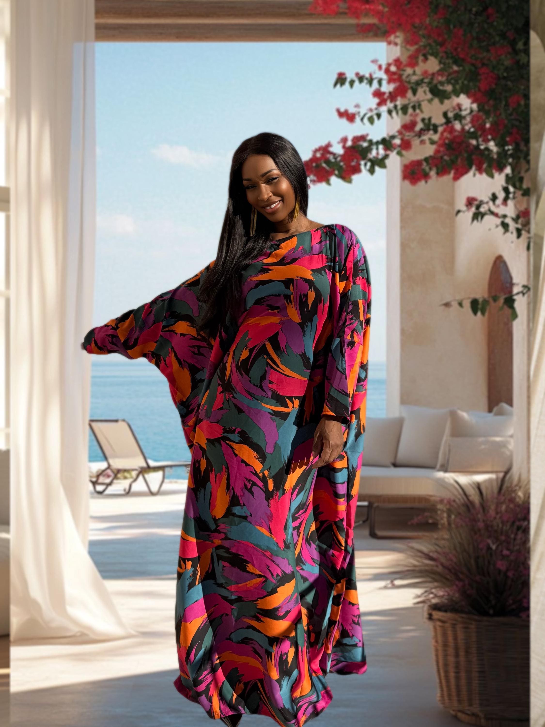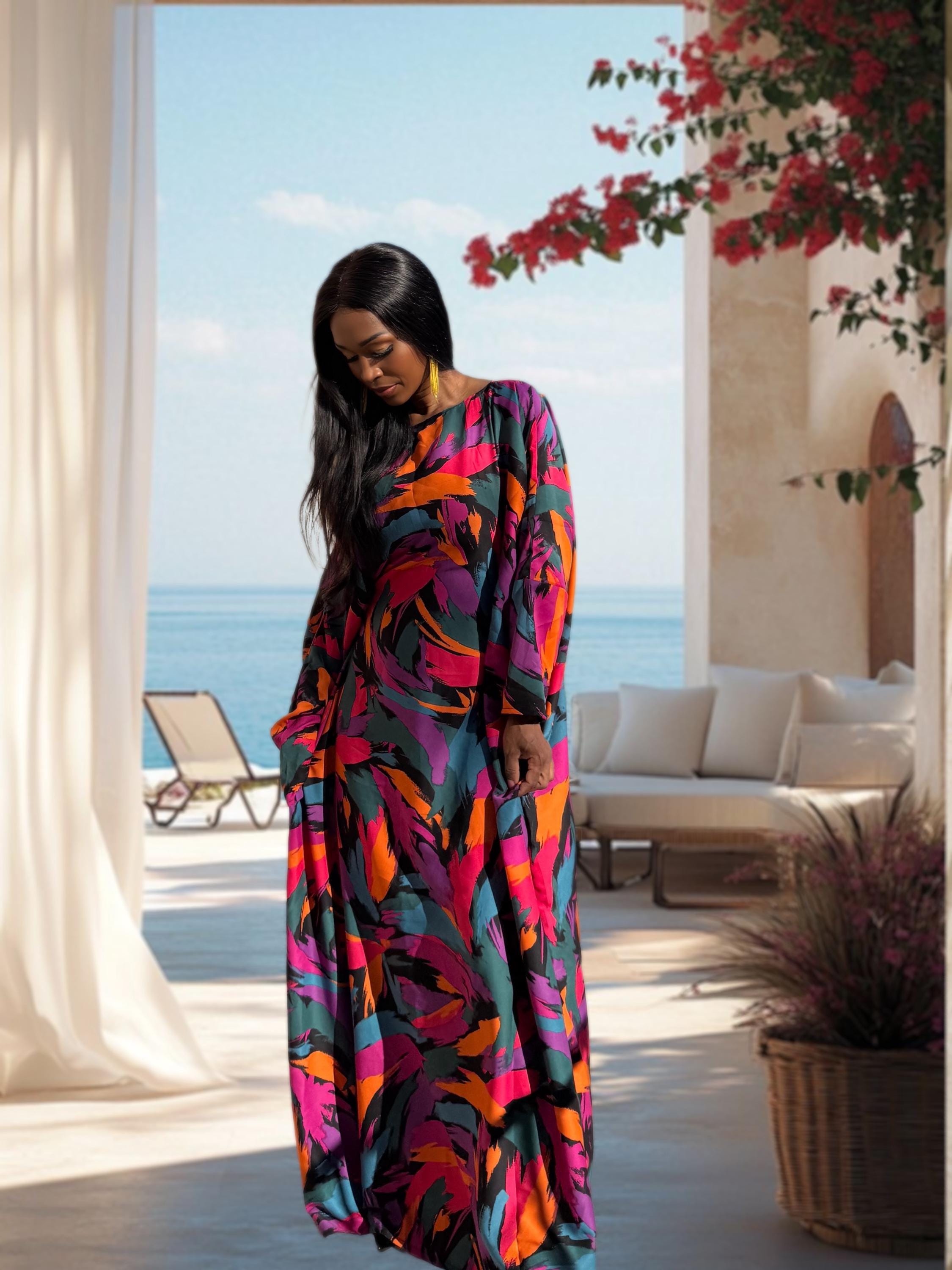 This vibrant multicolor kaftan features a bold abstract print that blends rich jewel tones with a modern oversized silhouette. Handmade to fit sizes S to 2XL, it’s designed for effortless elegance—whether you’re dressing for a resort getaway, a special event, or elevated everyday comfort. The striking color palette makes it a true statement piece while remaining timeless and versatile.