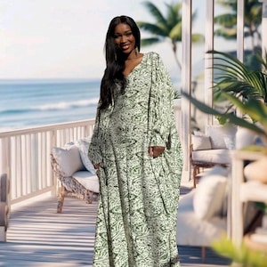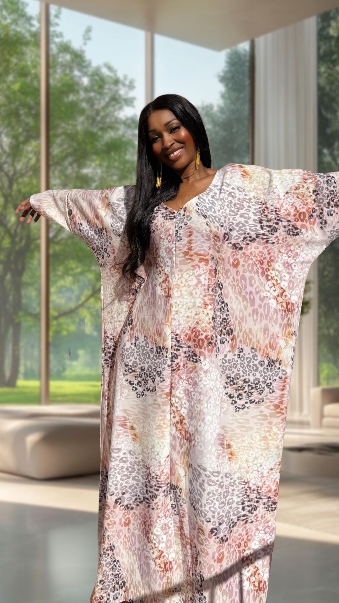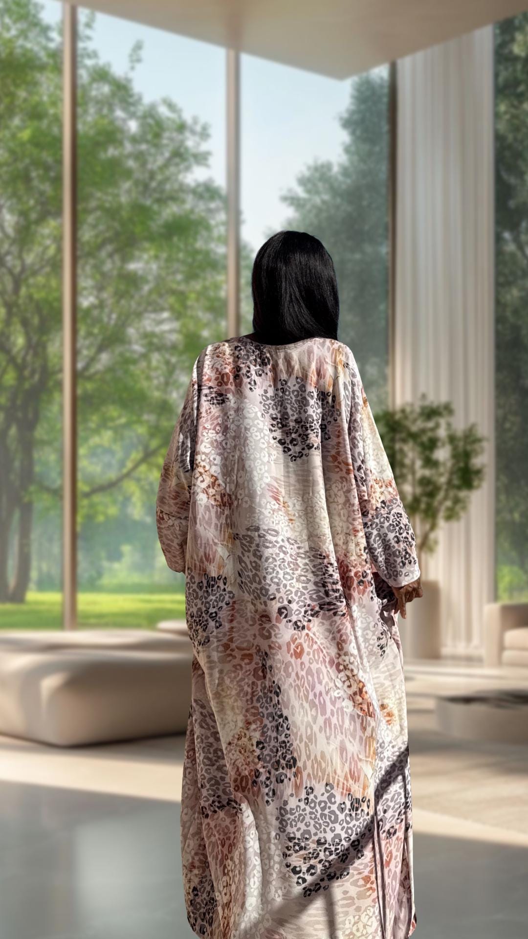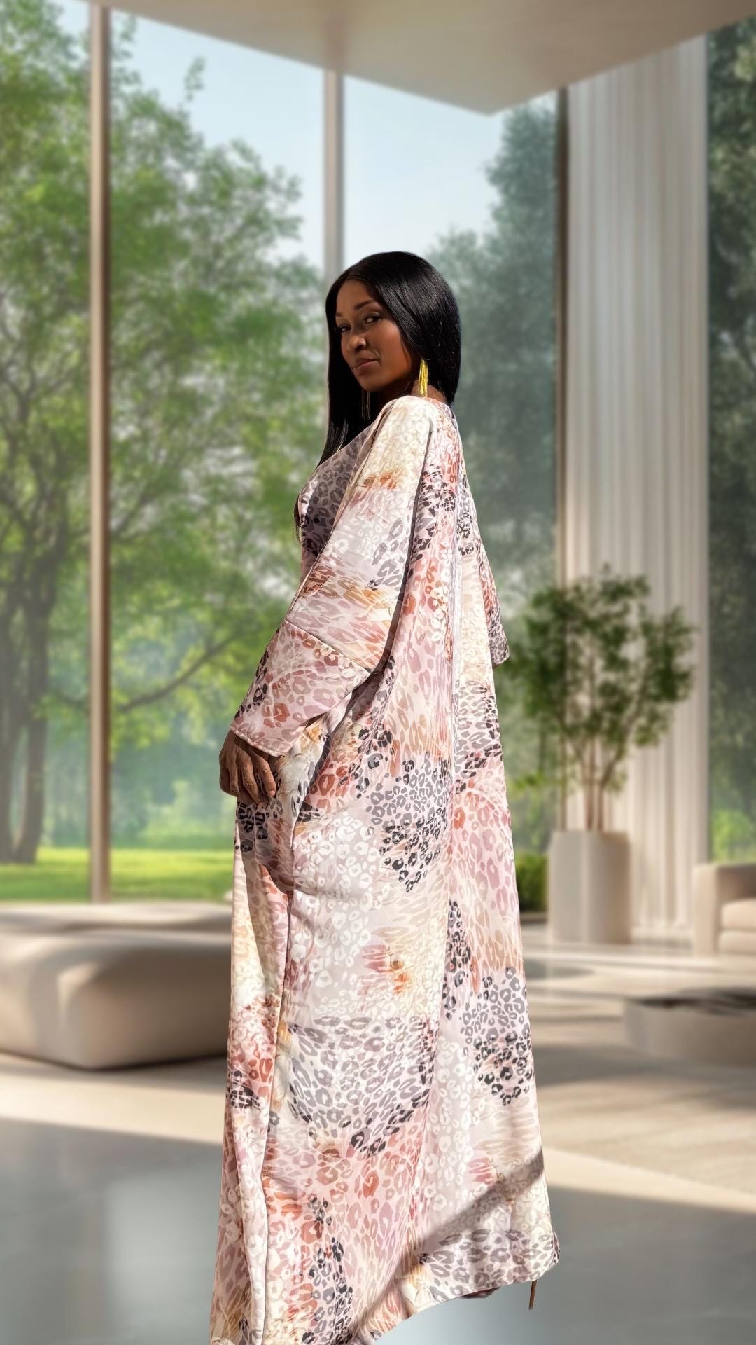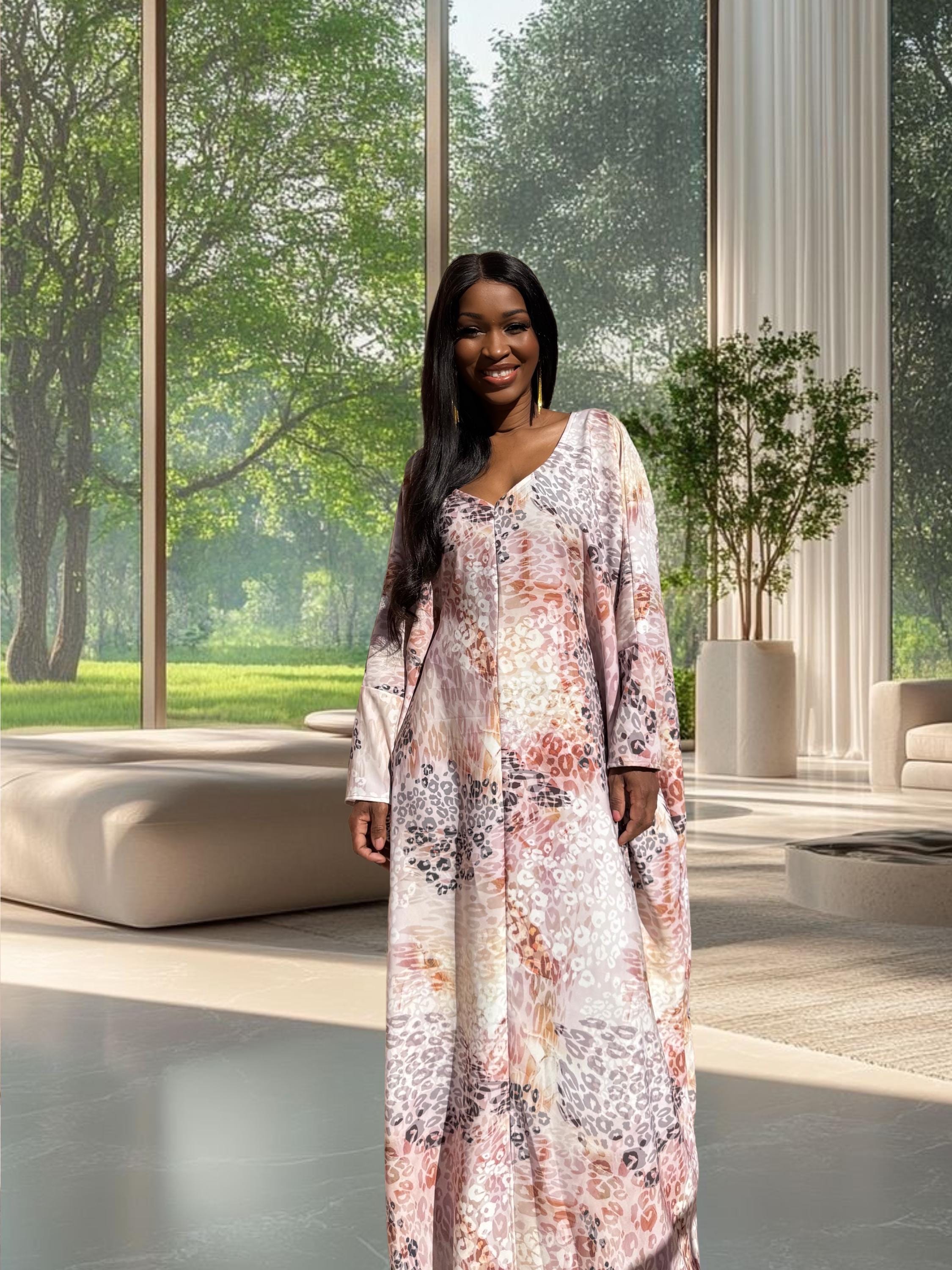 Soft, neutral tones meet bold animal print — this kaftan is the perfect balance of comfort and fierce feminine style. Its airy cut lets you move freely, while the satin fabric feels smooth and cool against the skin. Whether you’re entertaining guests at home, stepping out for brunch, or relaxing during the holidays — this kaftan makes every moment feel beautiful.